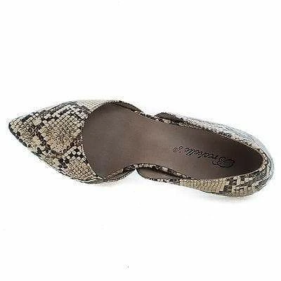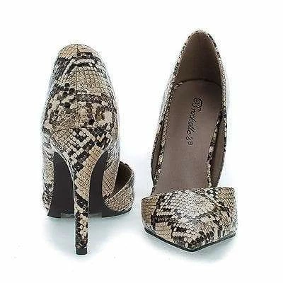 Dress to impress with these pointy toe D’Orsay classic stiletto heel dress pumps, featuring a pointy toe, contrast stitching, a slightly padded insole for extra comfort, an approximate 0.25 inch platform, and an approximate 4 inch high stiletto heel. (Please note that these measurements are based on a size 6). Available in Beige Snake (Beige), etc. All man made materials. By Breckelles Shoes.