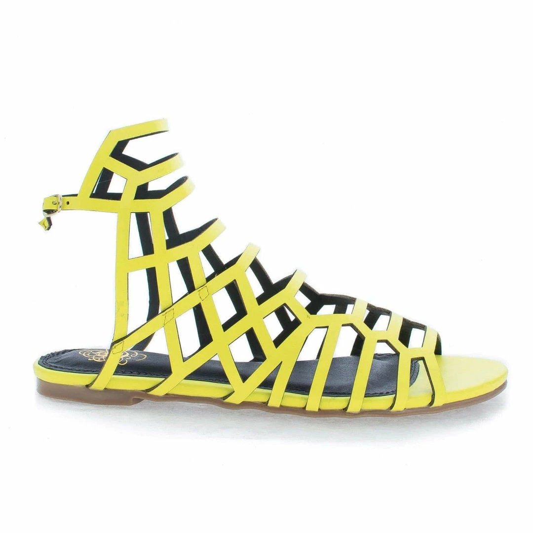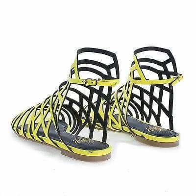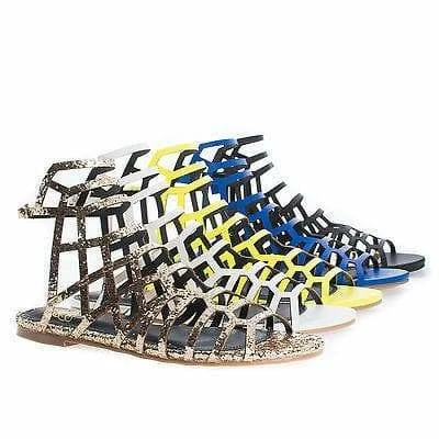 Be a trend setter with these honeycomb inspired geometrical flat sandals, featuring an open toe, contrast stitching, an adjustable sling back buckle strap, an extra padded insole for extra comfort, and an approximate 0.25 inch heel. (Please note that these measurements are based on a size 7). Available in Black, Neon Yellow, Blue, White, Gold, etc. All man made materials. By Aquapillar.