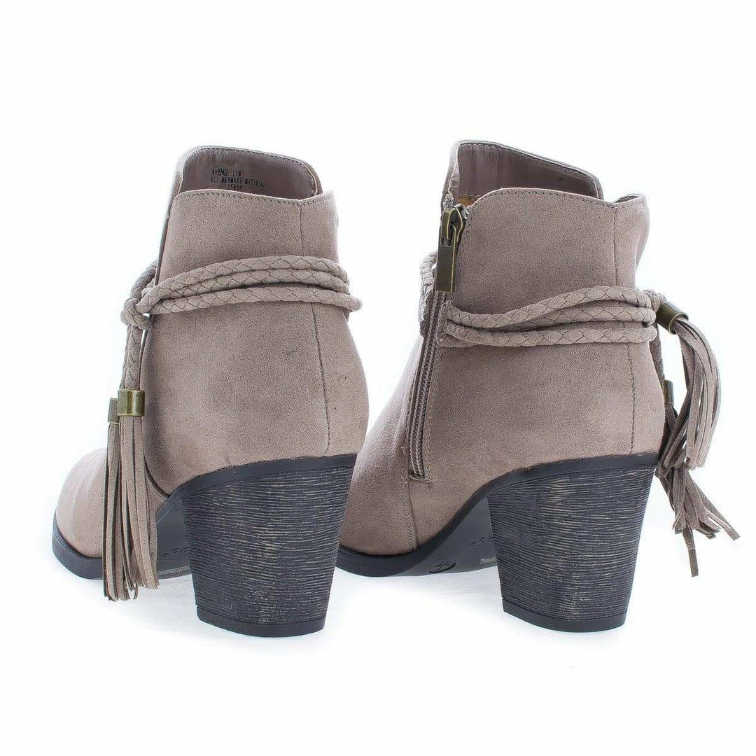 Walk in fashion and comfort in these western inspired ankle high heel boots, featuring an almond toe, contrast stitching, a braided laced tassel, a side zipper for easy wear and closure, a slightly padded insole for comfort, and an approximate 2.75 inch high stacked chunky heel. (Please note that these measurements are based on a size 7). Style fits true to size. Available in Black, Taupe (Gray), Natural (Brown), etc. All man made materials. By Aquapillar