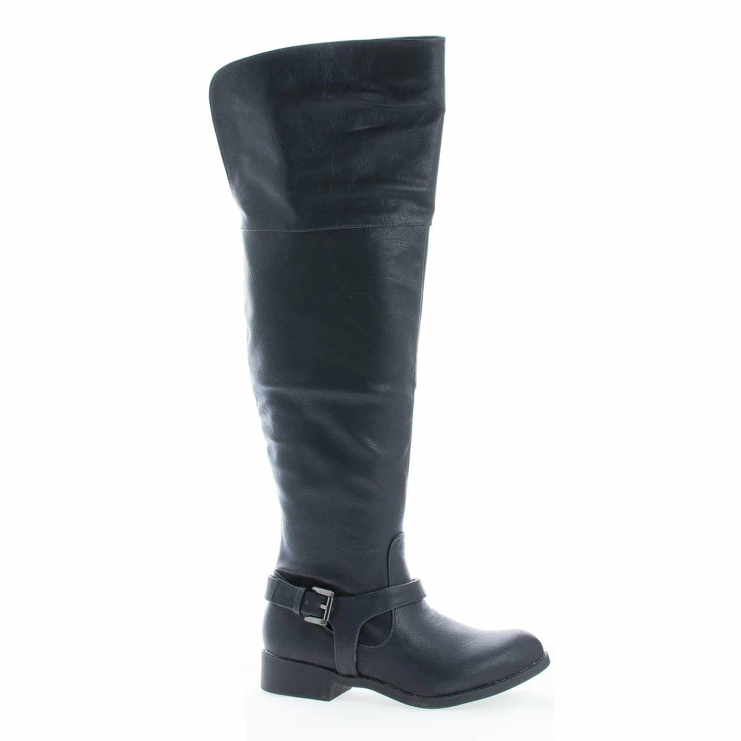 Be a trend setter with these harness ankle over the knee riding boots, featuring a round toe, contrast stitching, a decorative ankle buckle harness, a side zipper for easy wear and closure, a slightly padded insole for comfort, an approximate 20.5 inch high shaft, an approximate 0.25 platform, and an approximate 1.5 inch faux wooden heel. (Please note that these measurements are based on a size 7). Style fits true to size. Available in Black, Cognac, etc. All man made materials. By Wild Diva Shoes.