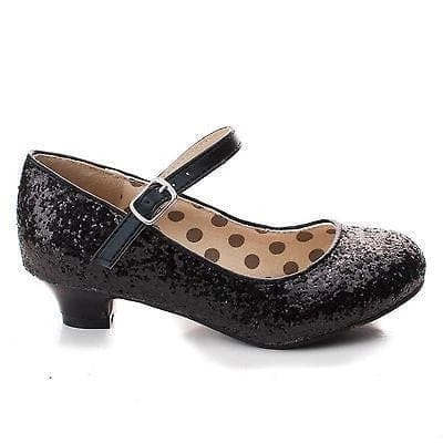 Doll up your girl with these sparkling mary jane pumps, featuring a round toe, an adjustable buckle ankle strap, rock glitter, a slightly cushioned insole for comfort, and an approximate 1 inch low heel. (Please note that these are children’s shoes, the measurements are based on a size 6.) Available in Black, Pink, Silver, Gold, etc. All man made materials. By Styluxe Shoes. .