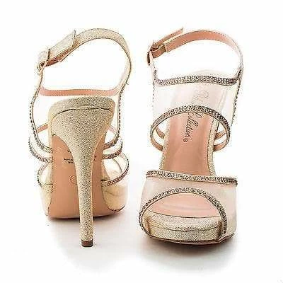 Make heads turn with these mesh and rhinestone studded dress heels, featuring a peep toe opening, mesh inserted straps, studded rhinestones, an adjustable slingback buckle ankle strap, a slightly padded insole, an approximate 0.75 inch platform for extra comfort, and an approximate 4.5 inch high stiletto heel. (Please note that these measurements are based on a size 6). Style runs small, suggested to purchase a half size bigger. Available in Black, Silver, Nude (Gold), etc. All man made materials. By Blossom Shoes. .
