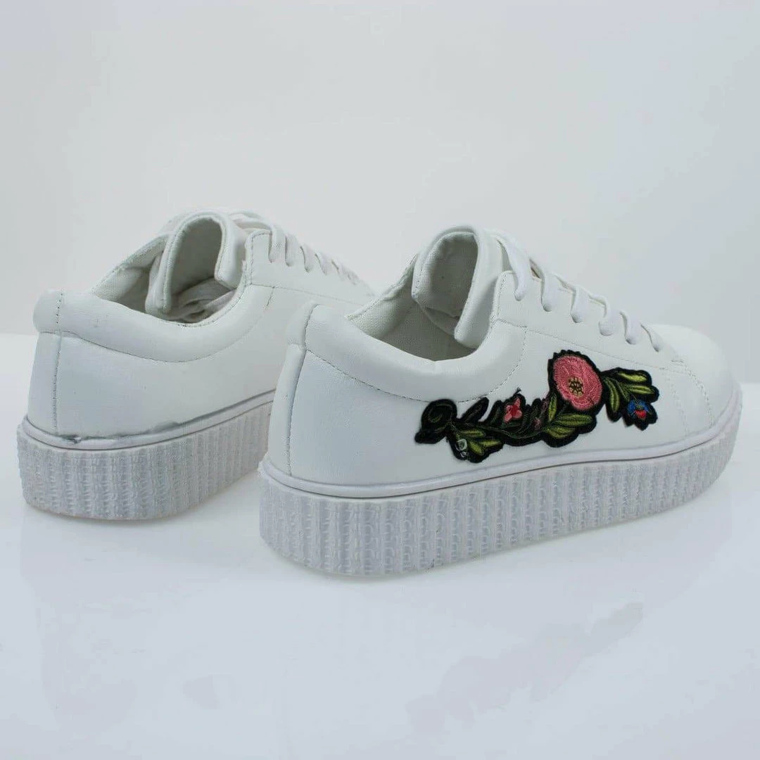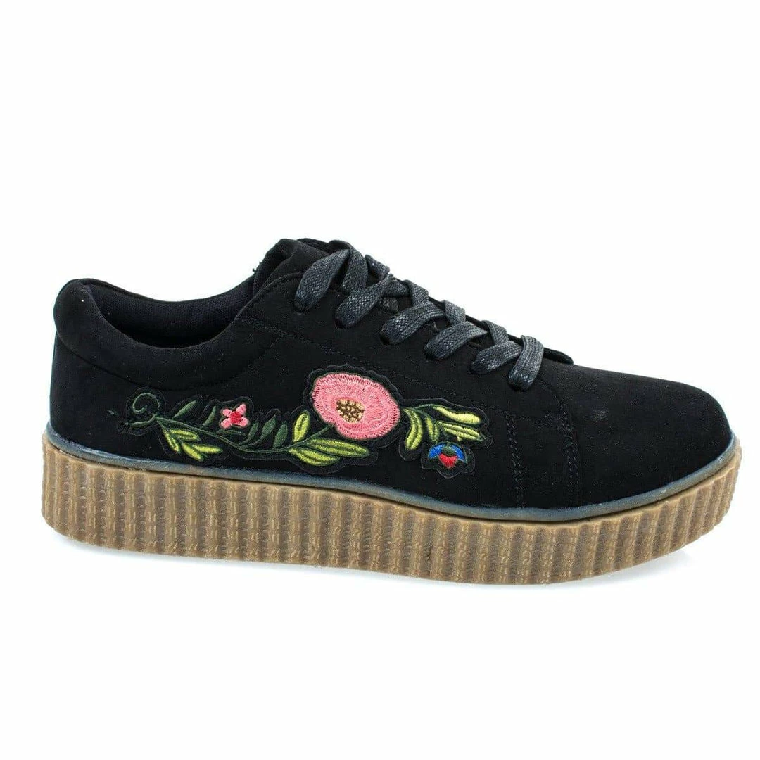About This Shoes :Walk all day with these super comfortable platform sneakers featuring rubber ribbed platform, lace up closure, heat pressed embroidered floral patches and round toe silhouette. Brand – Bamboo