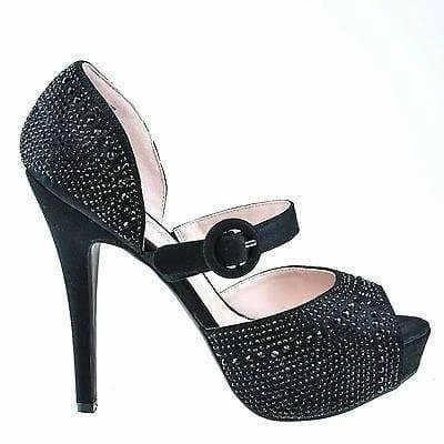 This adorable fashion heel is adorned with mini rhinestone studs that accents the mesh glitter exterior. Fastened by cut big buckle. Heel is 5 inches and platform is approximately 1 inches. Fits true to size. All man made materials. By Blossom.