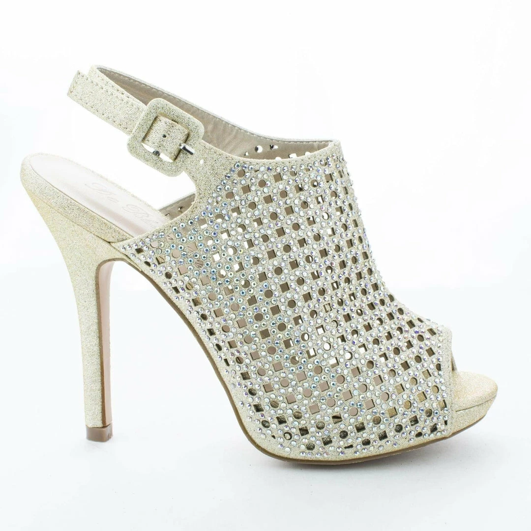 Glamour up any outfit with these platform sling backs, featuring a peep toe opening, contrast stitching, glitter, sparkling rhinestones, a slightly padded insole for comfort, an adjustable slingback buckle ankle strap, an approximate 1 inch low platform for extra comfort, and an approximate 4.5 inch high stiletto heel. (Please note that these measurements are based on a size 6). Style runs small, suggested to purchase a half size bigger. Available in Black, Silver, Nude (Gold), etc. All man made materials. By Blossom Shoes.