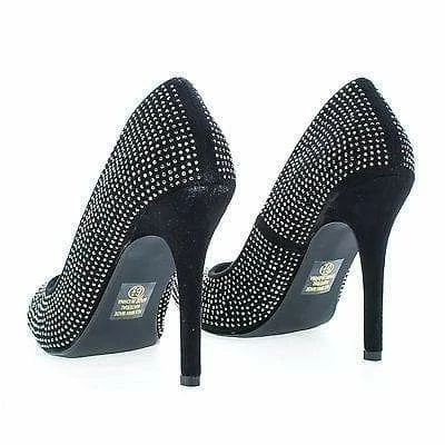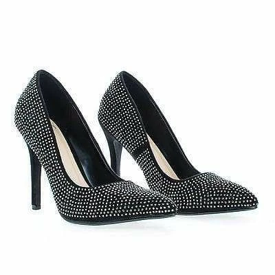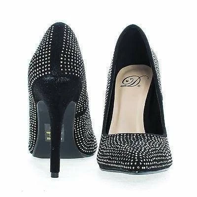 Make heads turn with these sparkling stiletto heel dress pumps, featuring a pointy toe, contrast stitching, sparkling rhinestones covering the entire shoe, a slightly padded insole for comfort, and an approximate 4.5 inch high stiletto heel. (Please note that these measurements are based on a size 6). Available in Black, Red, etc. All man made materials. By Delicious Shoes.
