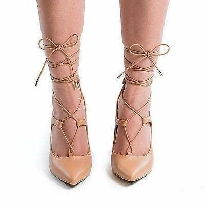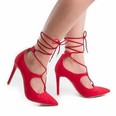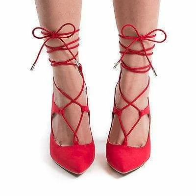 Walk high in fashion with these head turning stiletto high heel lace up ankle wrap dress pumps, featuring a pointy toe, contrast stitching, adjustable lace, a slightly padded insole for comfort, and an approximate 4.5 inch high stiletto heel. (Please note that these measurements are based on a size 7). Style fits true to size. Available in Black, Red, Natural, etc. All man made materials. By Aquapillar