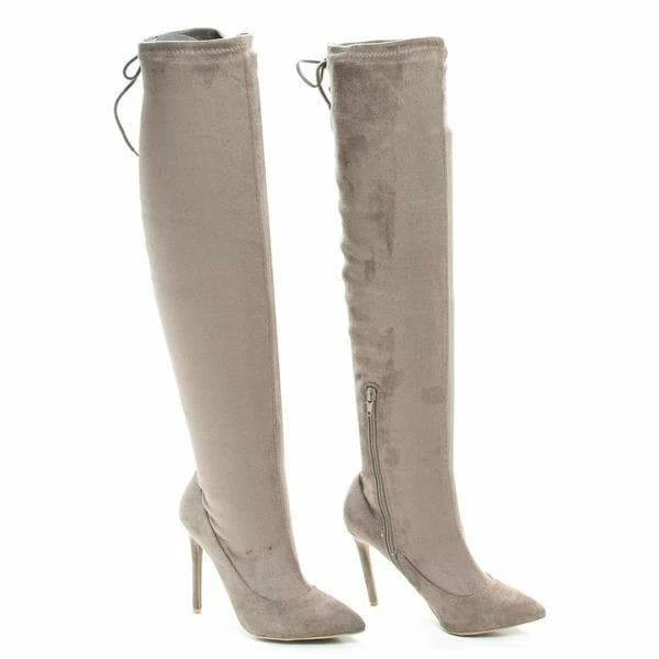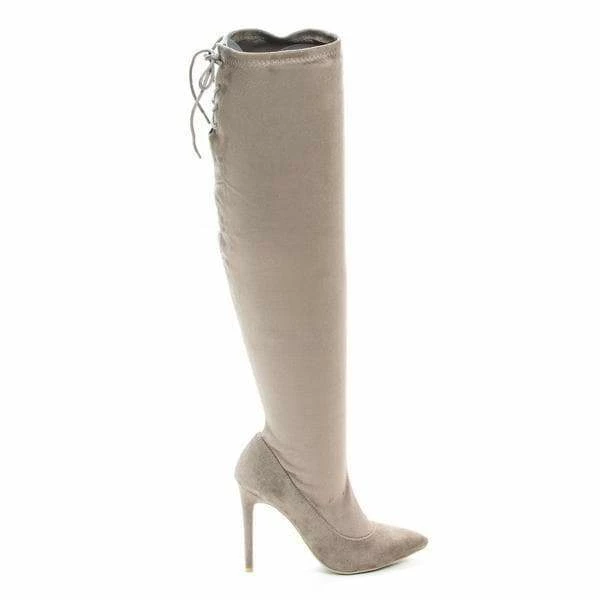 Over the knee boots on stiletto heel and vintage lace up tie fastening drawstring on the back for a sexy sleek look and great flexibility in fitting for most people. The shaft measures 20 inches starting where the heel begins and the heel is about 3.75 inches tall. Side zipper is available on for easy slide in. (Please note that these measurements are based on a size 7). Style fits true to size. Available in Light Taupe (Gray), Black etc. All man made materials. Why buy expensive brand name shoes when you can get inexpensive alternative, with this style you can afford to have beautiful styles without compromising the quality or the price. By Anne Michelle