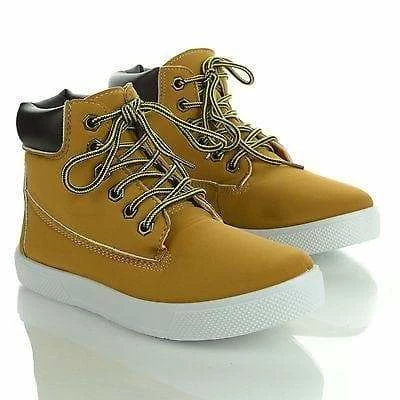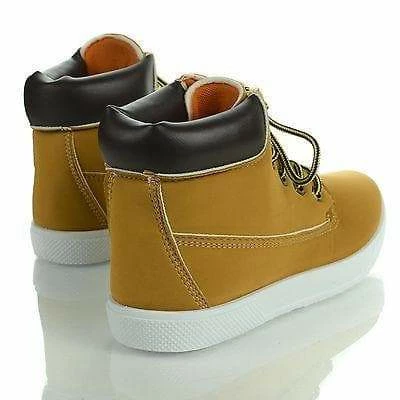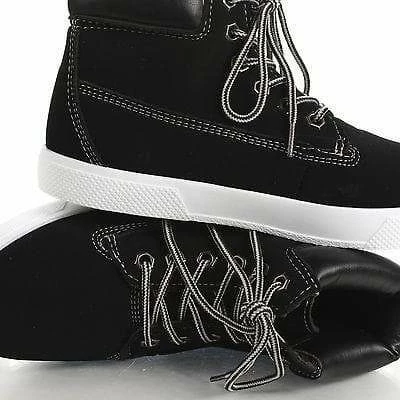 Fashion meets comfort in these work inspired flat sneaker boots, featuring a round toe, contrast stitching, adjustable laces, a padded ankle cuff collar, a cushioned insole, an approximate 1 inch flat heel, and an approximate 4 inch high shaft. Style fits true to size. Available in Black, Tan, etc. All man made materials. By Wild Diva Shoes.