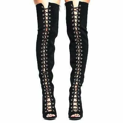 Shallow By Dollhouse, Thigh High Peep Toe Corset Elastic Lace Stiletto High Heel Boots New