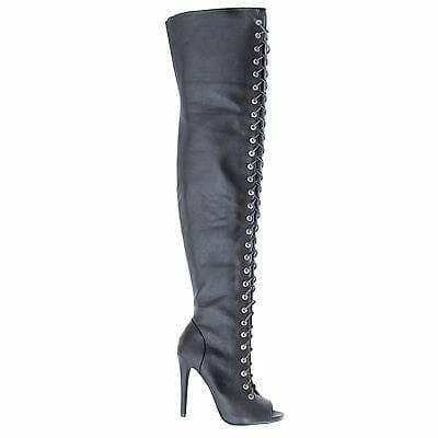 Make heads turn with these thigh high over the top stiletto high heel boots, featuring a peep toe, contrast stitching, elastic corset like laces, a side zipper for easy wear and closure, faux suede lining, a slightly padded insole for comfort, an approximate 24 inch high shaft, an approximate 0.5 inch platform, and an approximate 4.75 inch high stiletto heel. (Please note that these measurements are based on a size 6). Style fits true to size. Available in Black (Black Pu), Black Imsu etc. All man made materials. By Dollhouse Shoes.