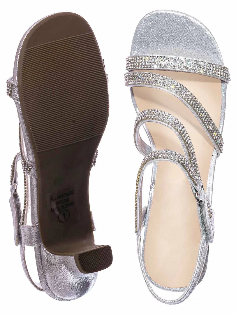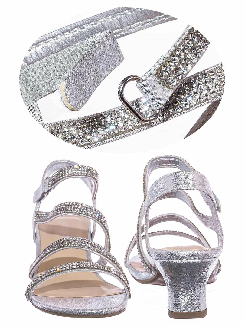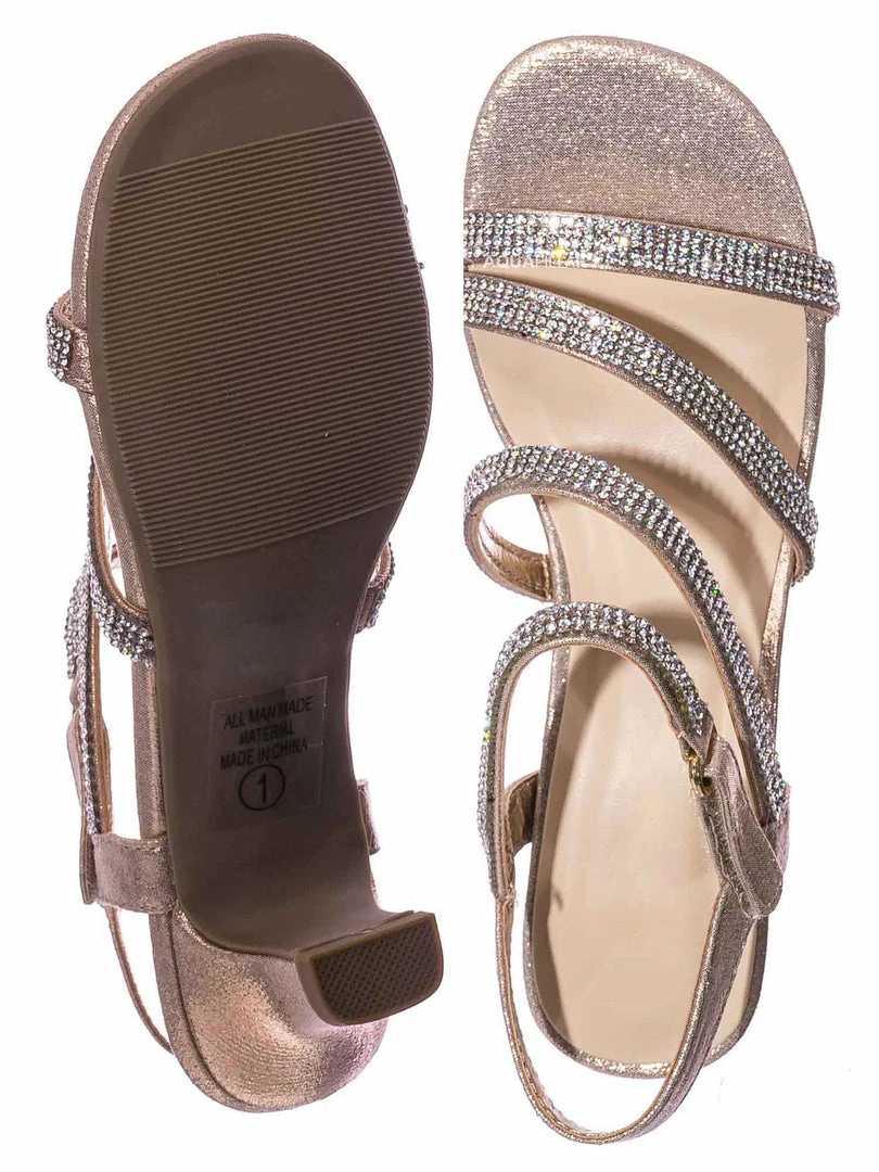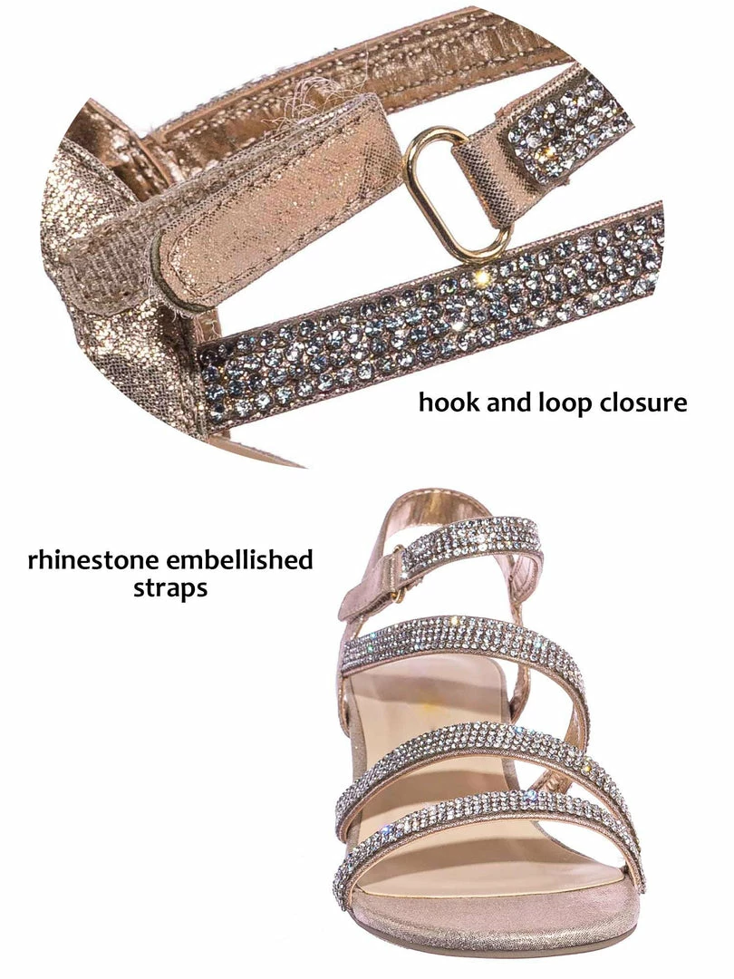 Product Detail : These dress sandal for little kids features a shimmering rhinestone crystal gem embellished straps with a comfortable block heel. The sandal can be strapped in with a easy to snap on hook and loop and the fabric is in mesh glitter.