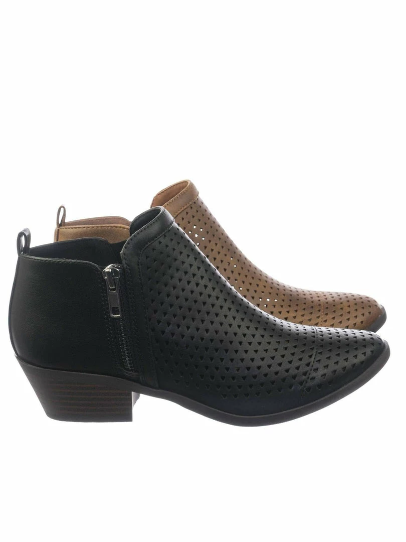 About This Shoes :These ankle booties features a chunky block heel in faux wood grain, decorative non functional outter zipper, a functional inner zipper, almond toe, triangle perforated cut out pattern and vintage fabric.