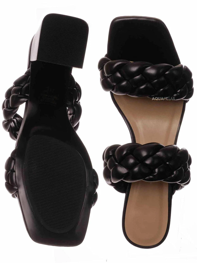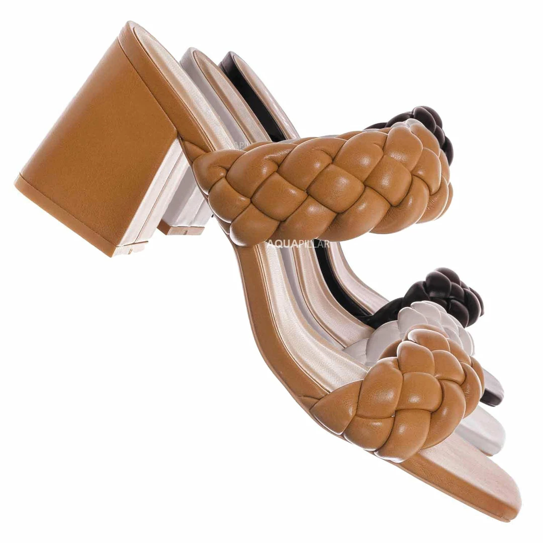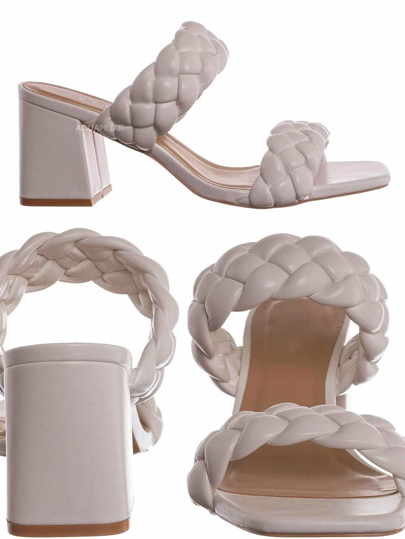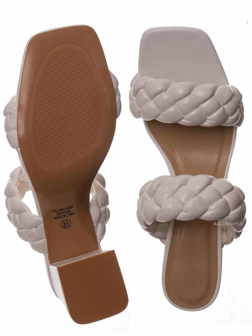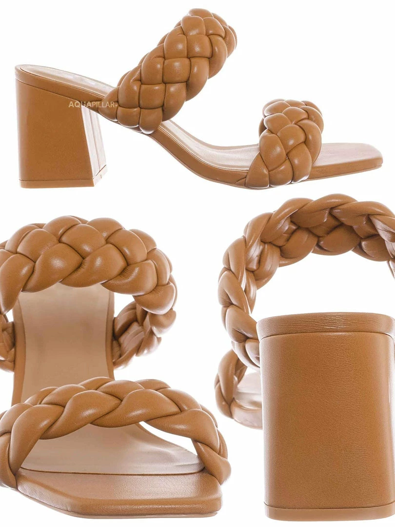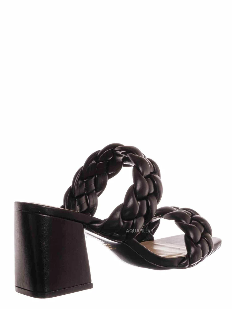 Product Detail : These slide features a medium height chunky block high heel with open squared toe and braided double strap. Slide into these sandal easily in the strappy mule silhouette with puffy braids and comfortably padded insole