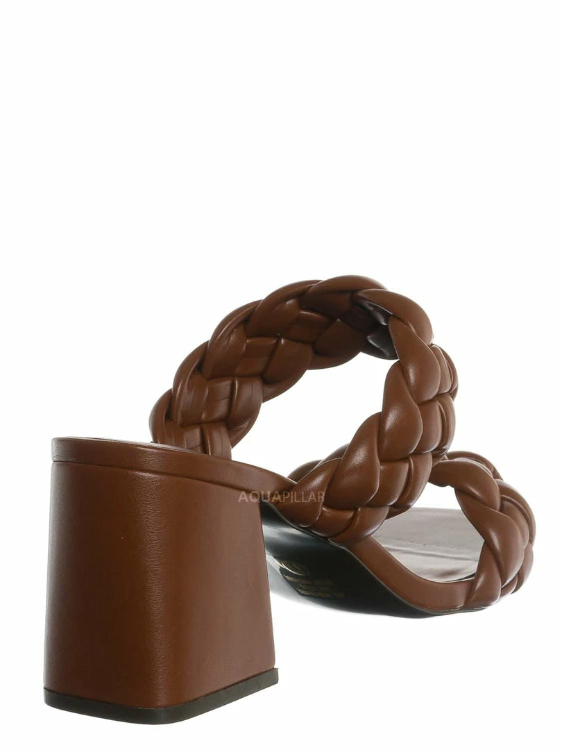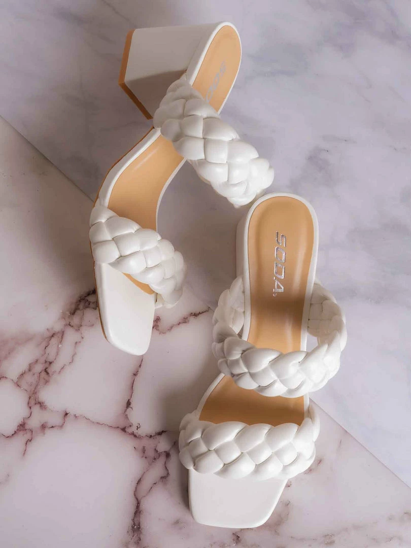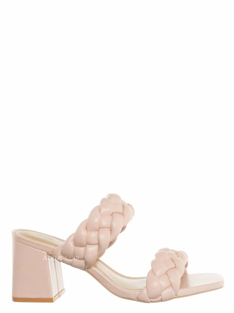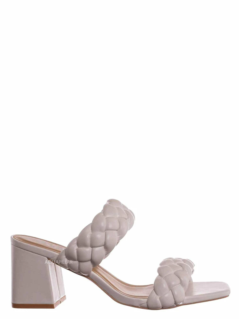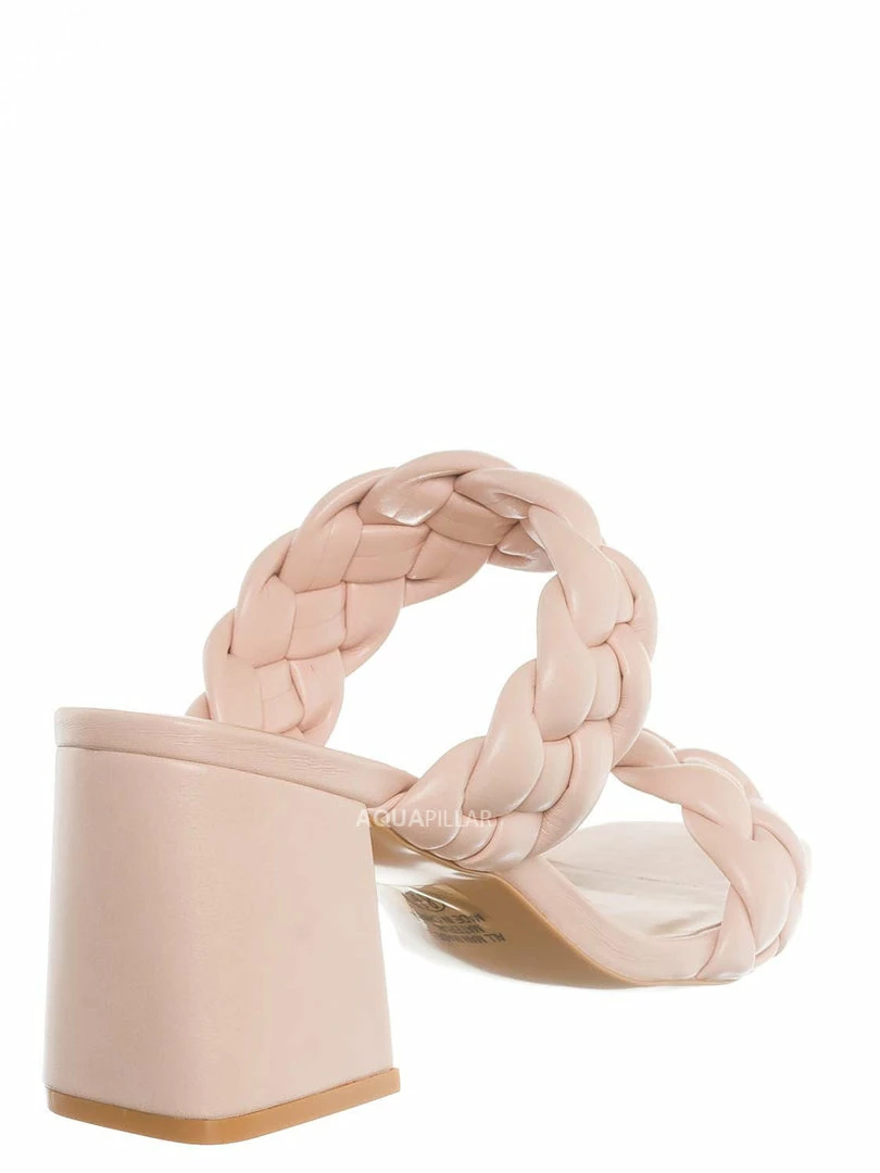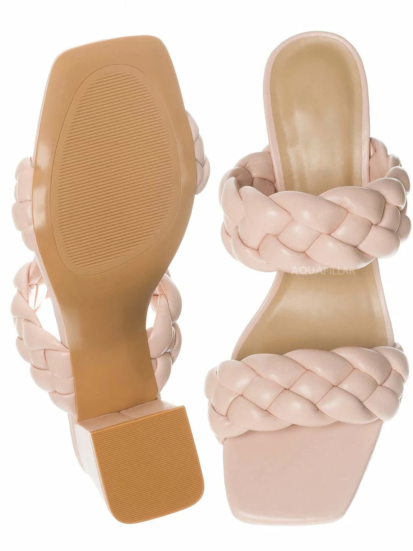 Product Detail : These slide features a medium height chunky block high heel with open squared toe and braided double strap. Slide into these sandal easily in the strappy mule silhouette with puffy braids and comfortably padded insole