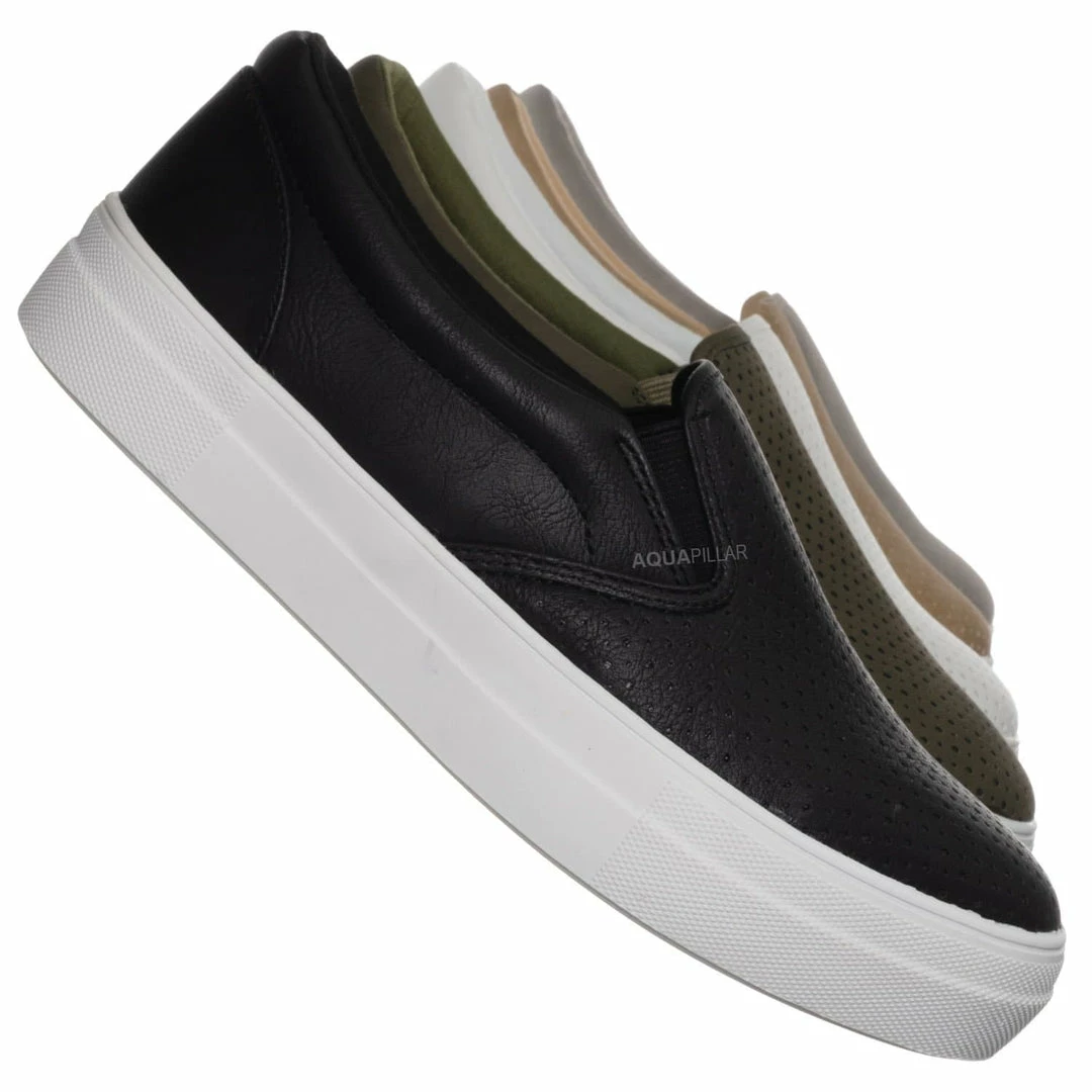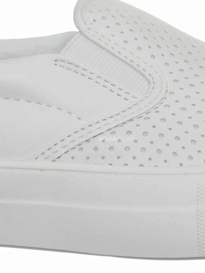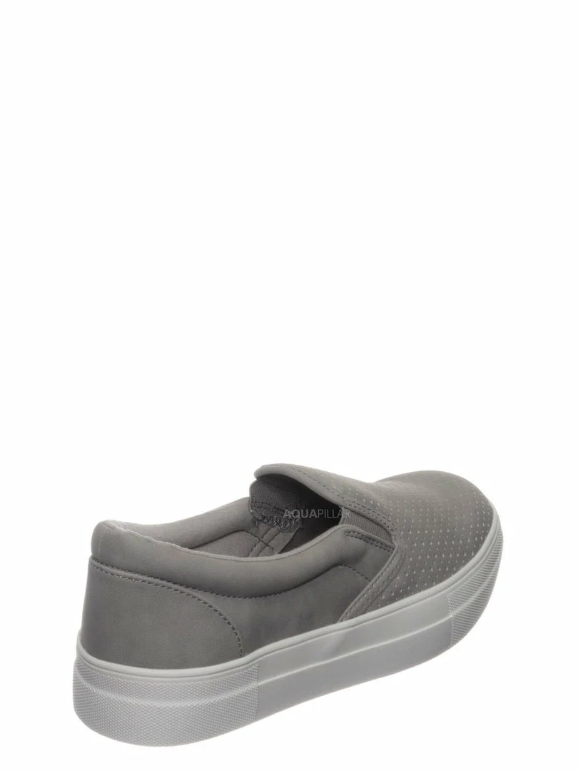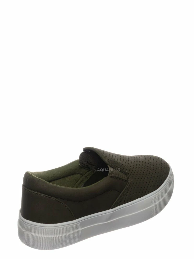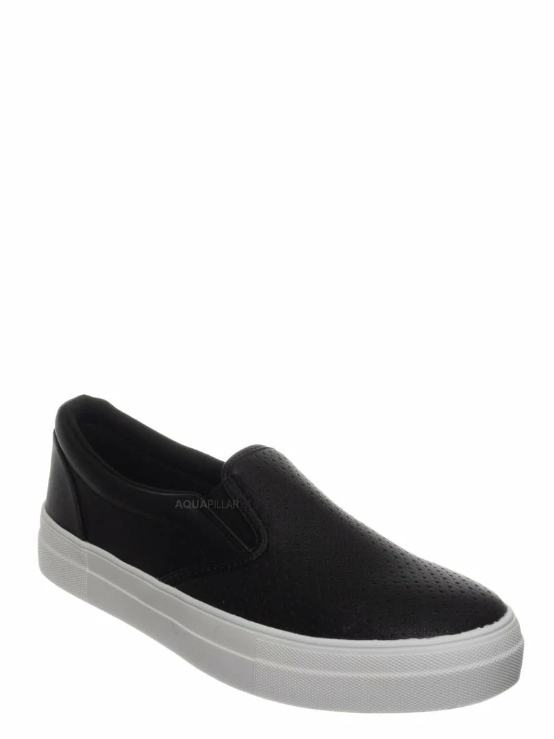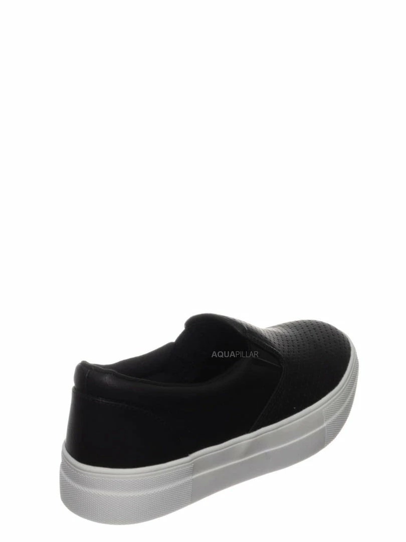 Product Detail : These flatform sneakers features a comfortable thick rubber platform, foam padded insole, perforated dot pattern, rounded closed toe, slip on loafer construction, side elastic for easy closure, padded back collar.