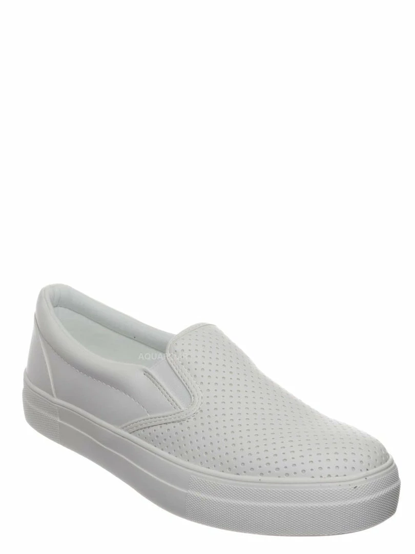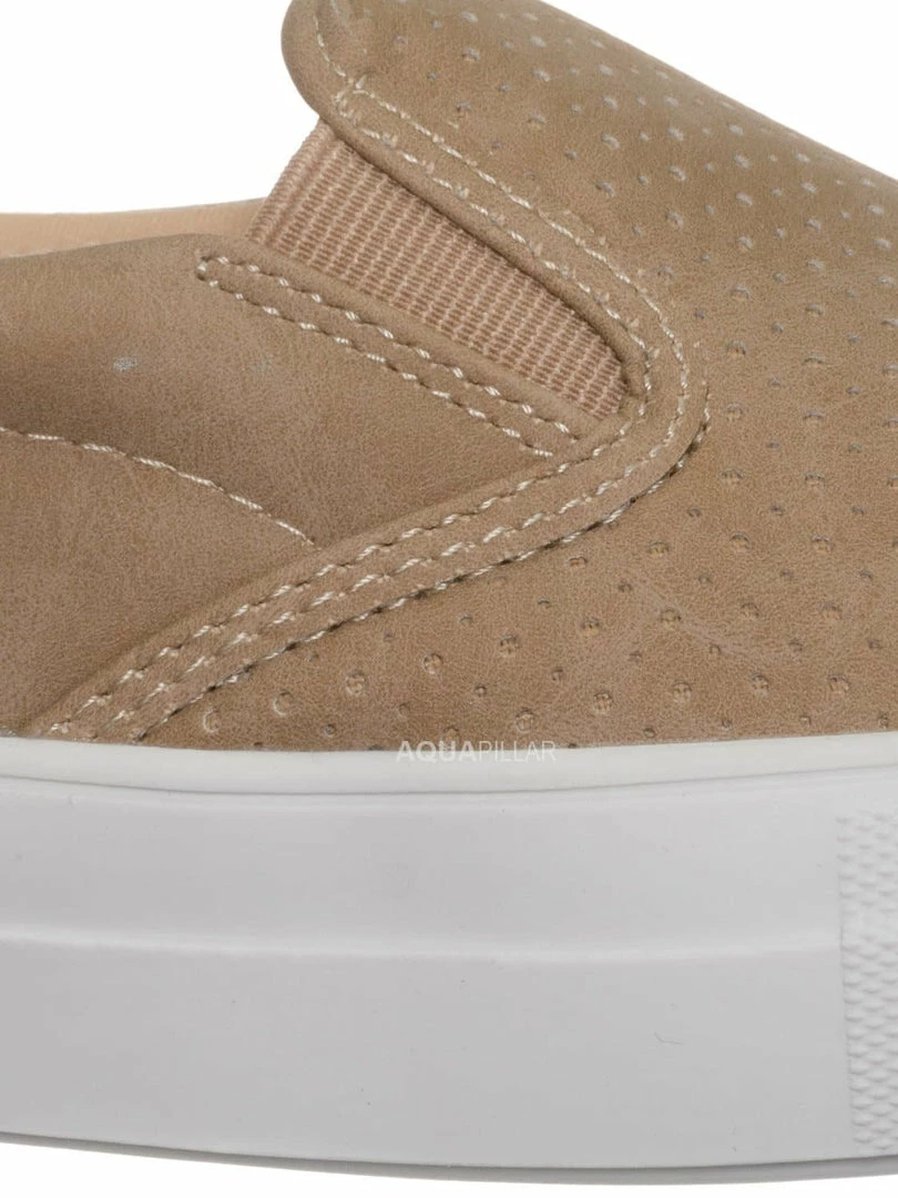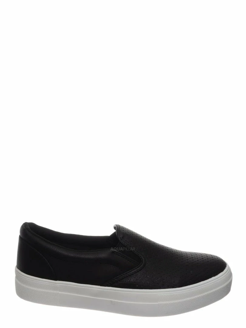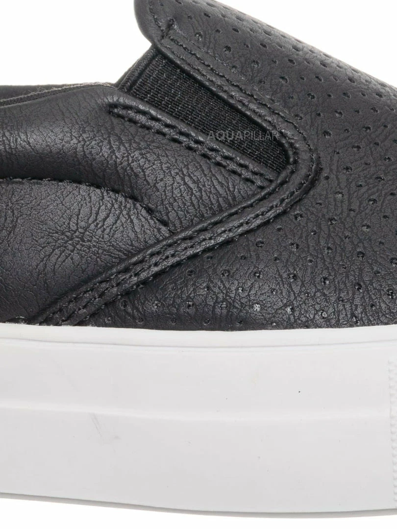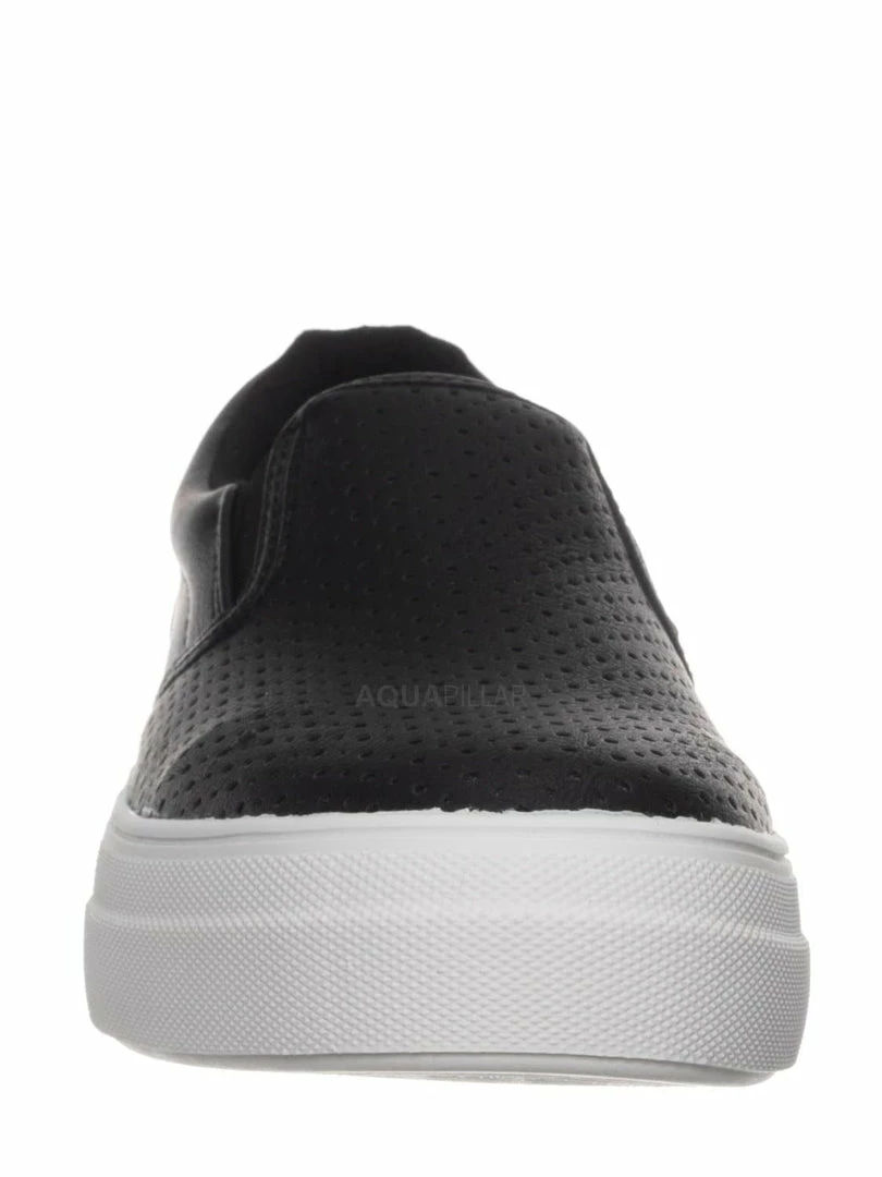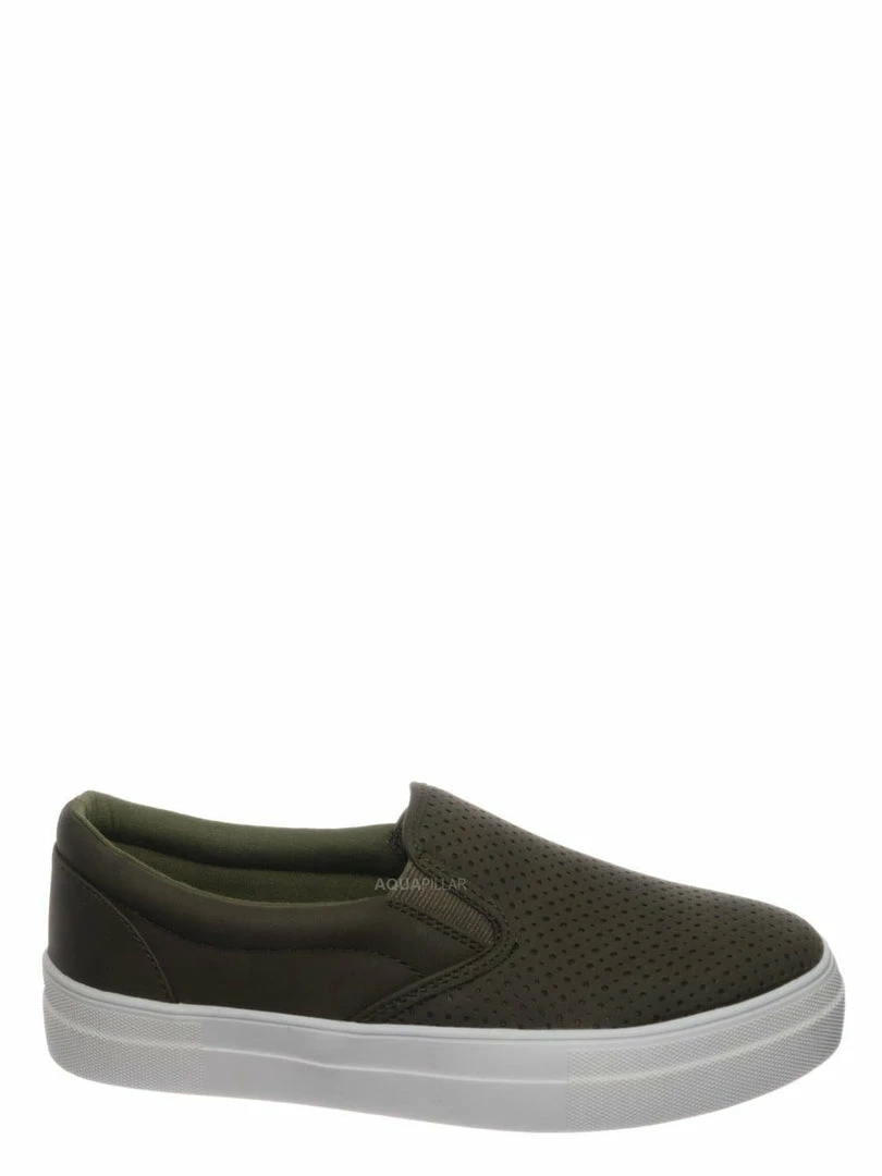 Product Detail : These flatform sneakers features a comfortable thick rubber platform, foam padded insole, perforated dot pattern, rounded closed toe, slip on loafer construction, side elastic for easy closure, padded back collar.