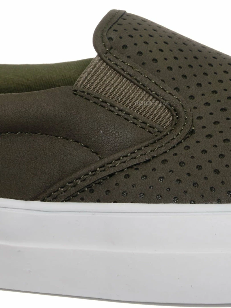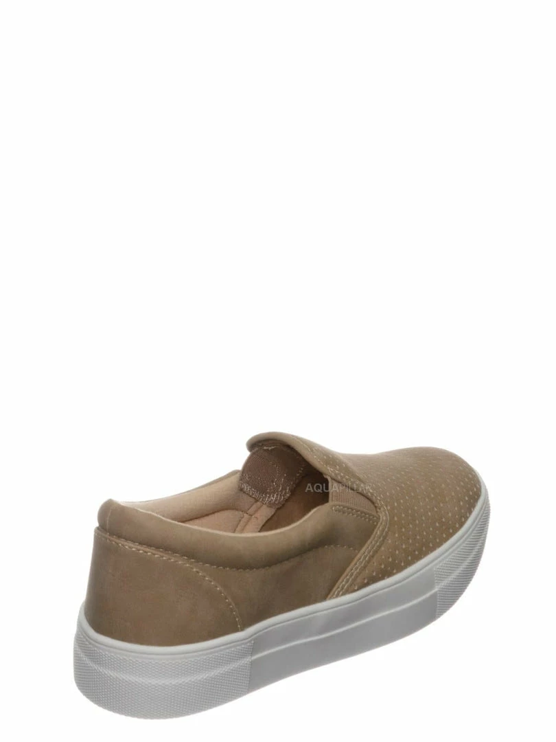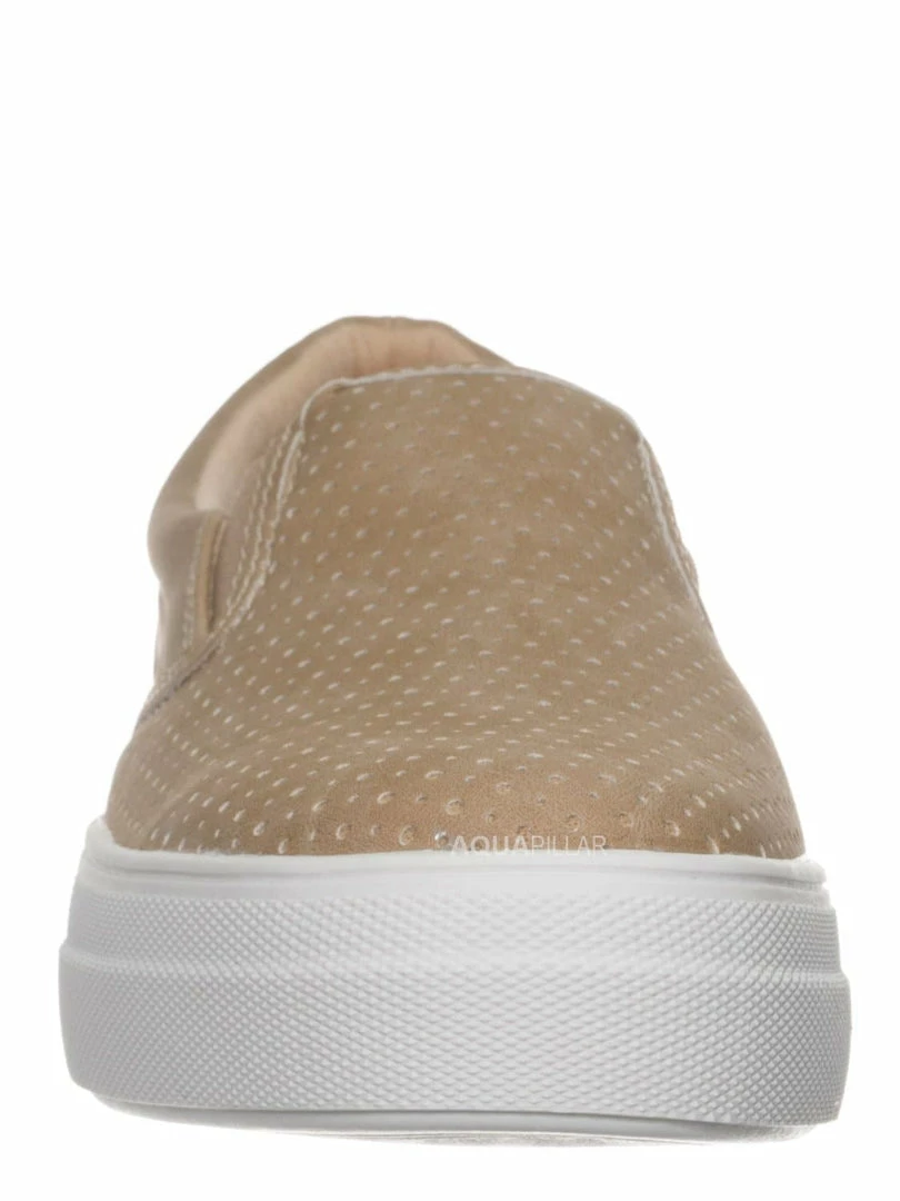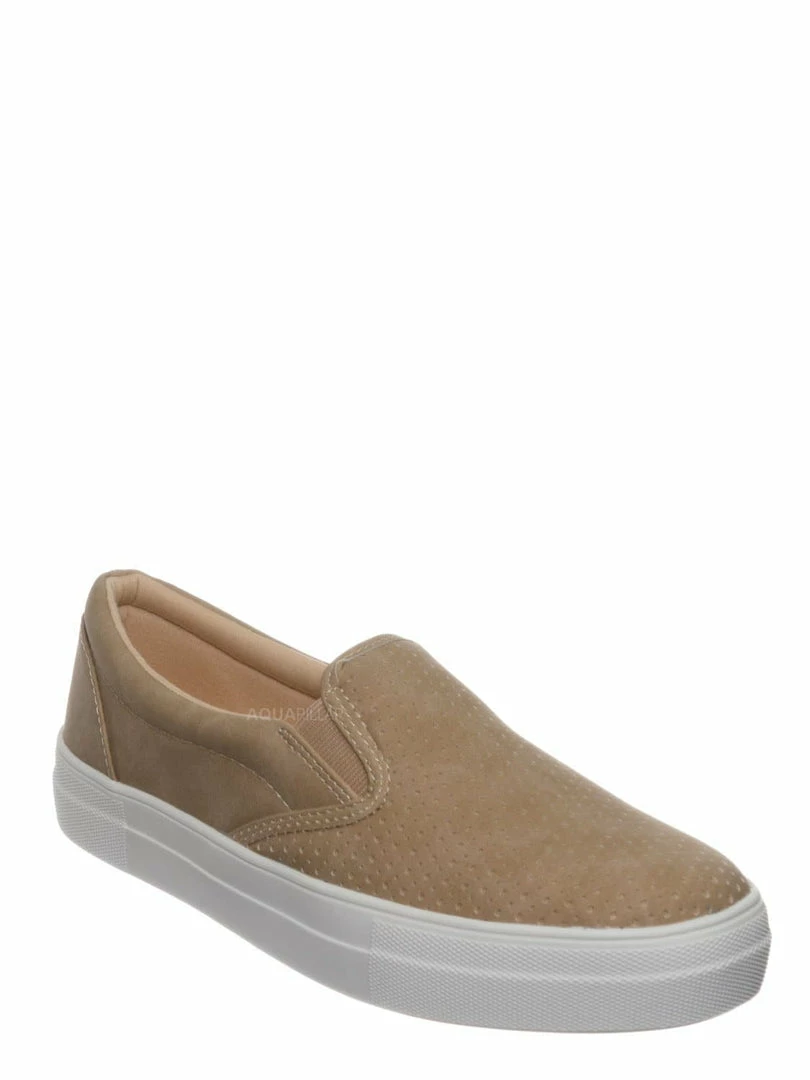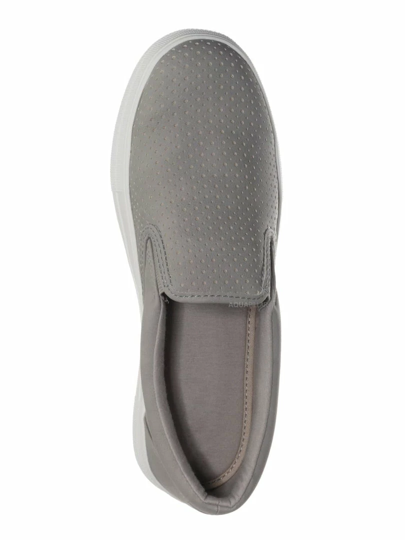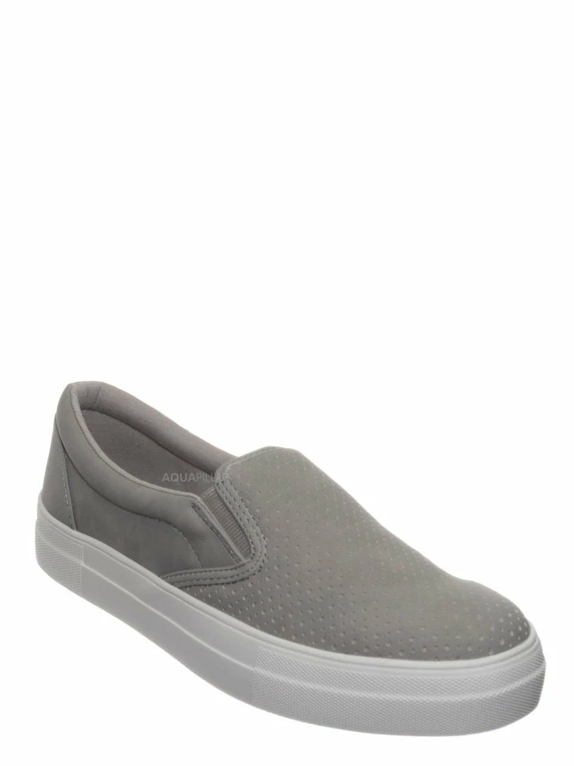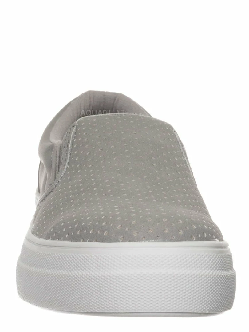 Product Detail : These flatform sneakers features a comfortable thick rubber platform, foam padded insole, perforated dot pattern, rounded closed toe, slip on loafer construction, side elastic for easy closure, padded back collar.