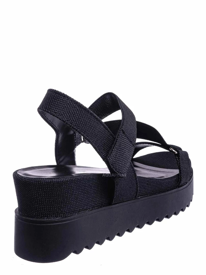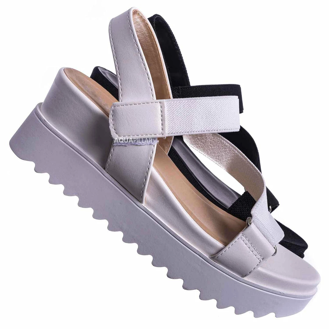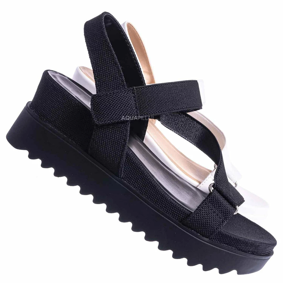 Product Detail: These sporty sandals feature an athleisure silhouette, comfortable thick platform, threaded Sharktooth outsole, nylon looping strap, easy to snap on hook and loop closure, and foam padded insole