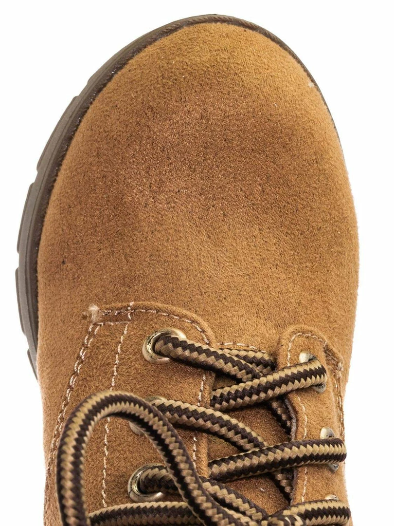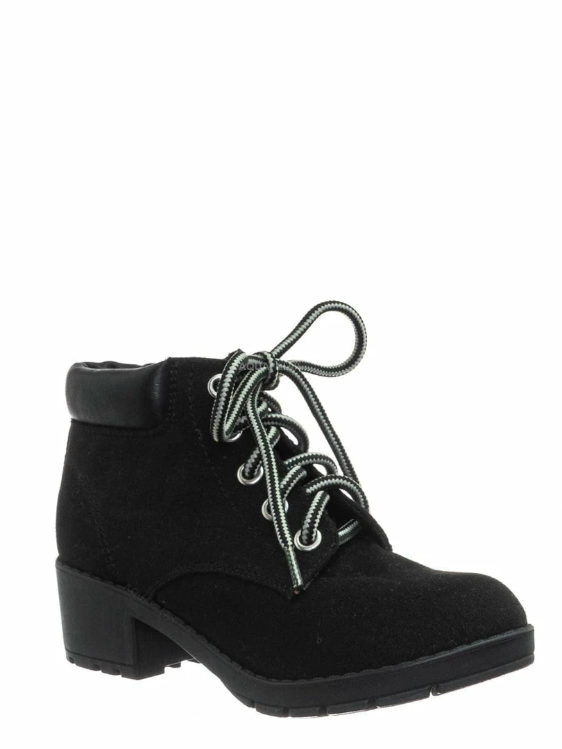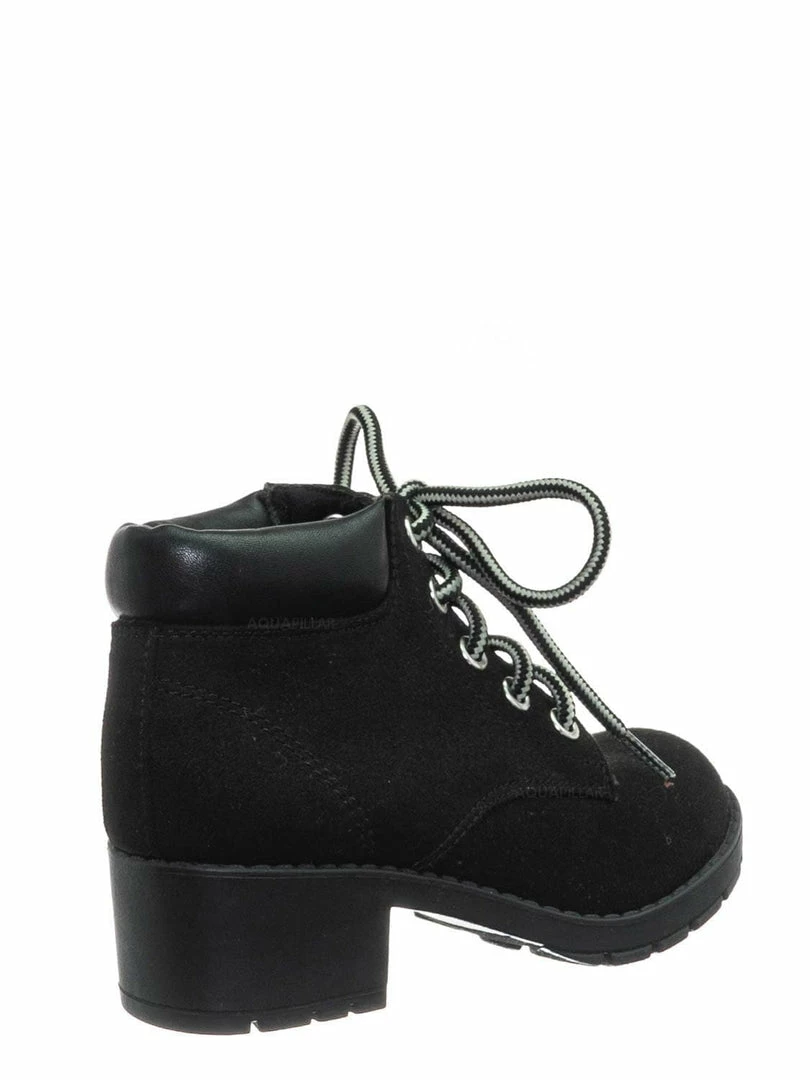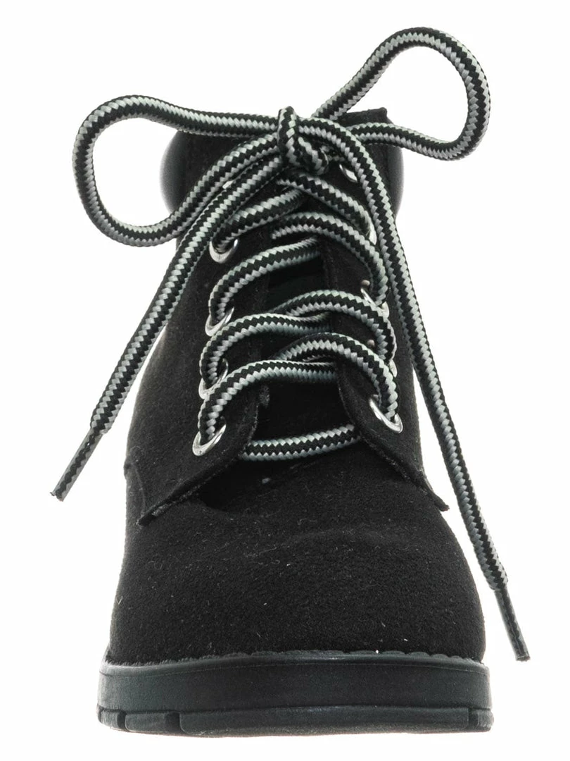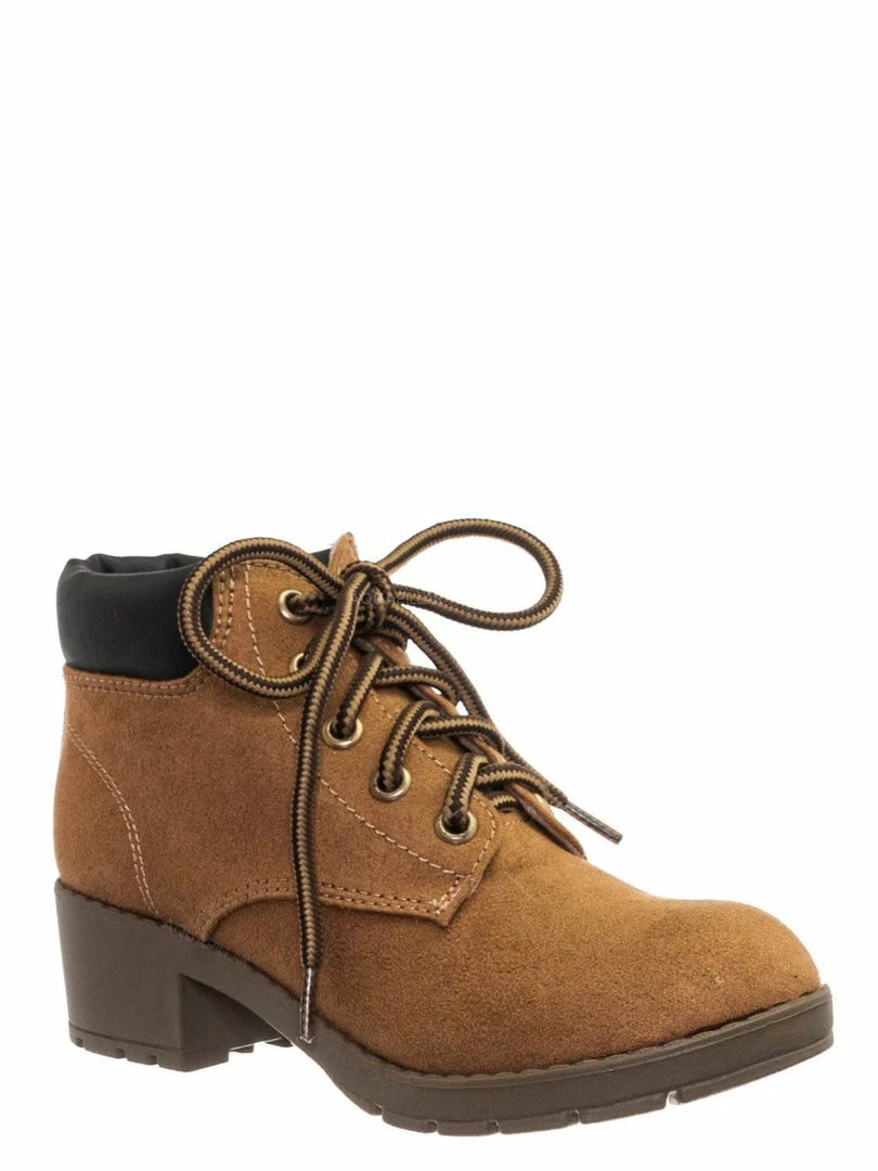 Product Detail : These boots for children features a classic work boots silhouette, ankle height shaft, padded collar, chunky block high heel, threaded lug sole, full frontal lace up closure and lightly padded insole.
