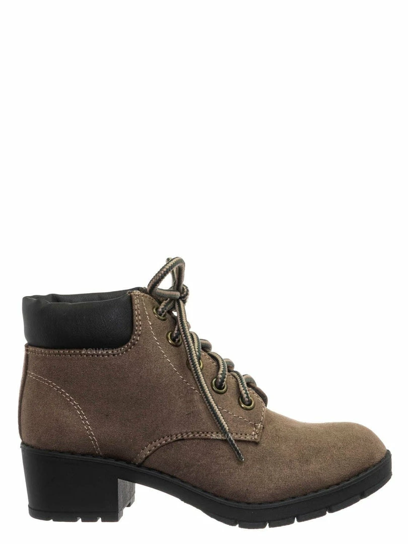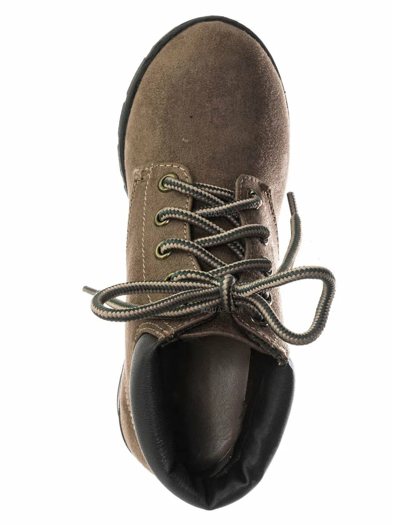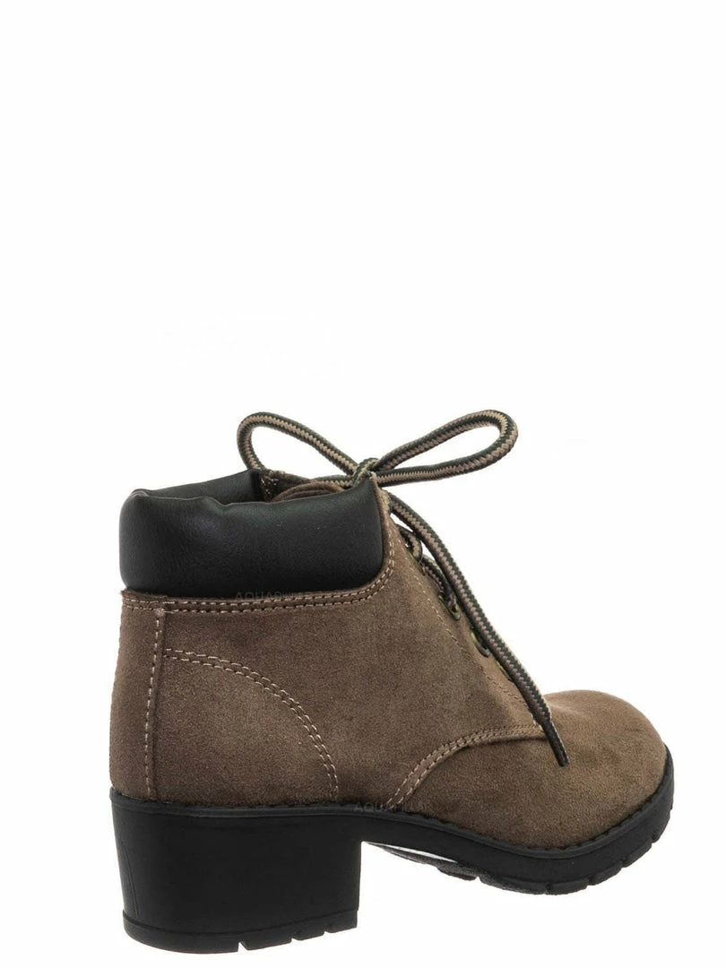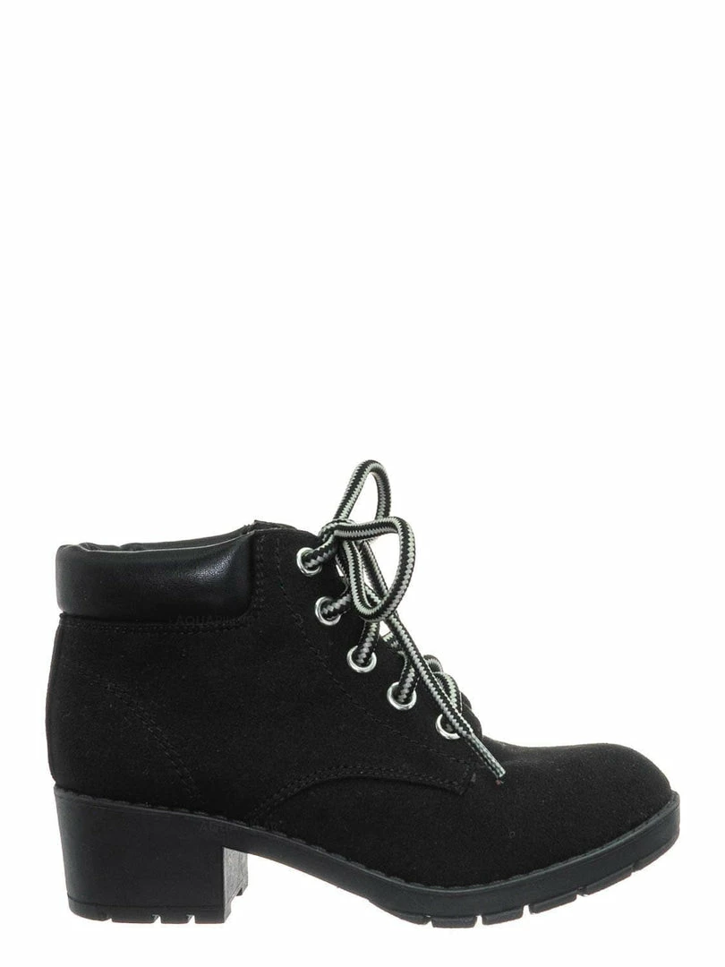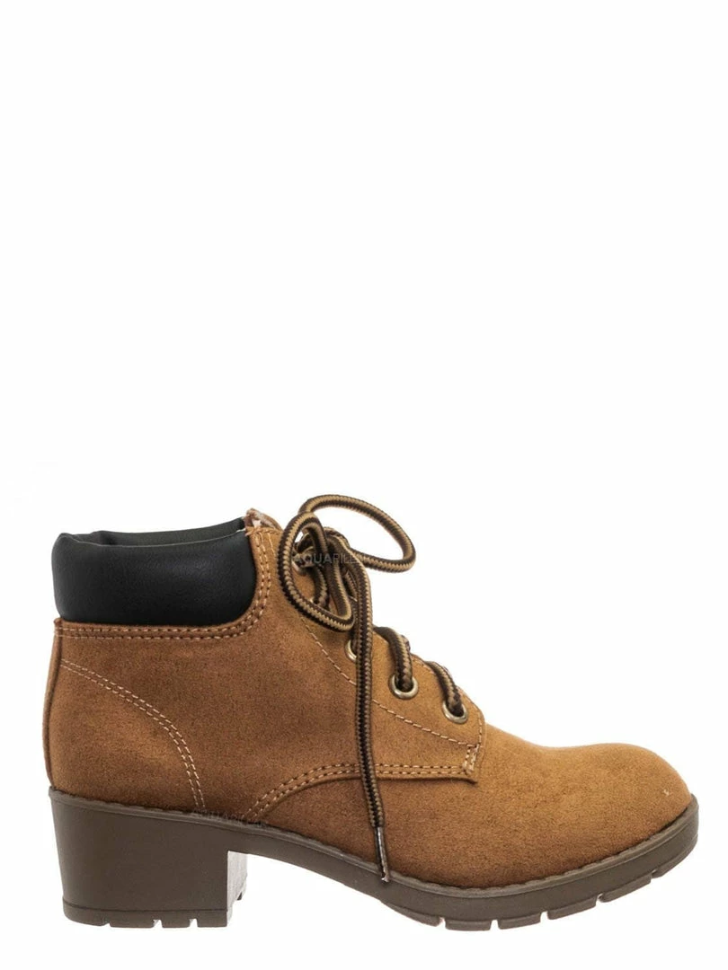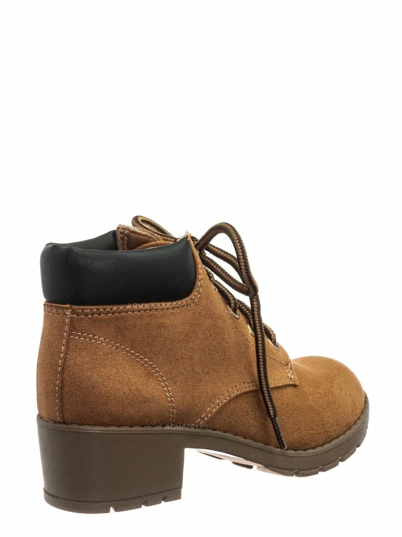 Product Detail : These boots for children features a classic work boots silhouette, ankle height shaft, padded collar, chunky block high heel, threaded lug sole, full frontal lace up closure and lightly padded insole.