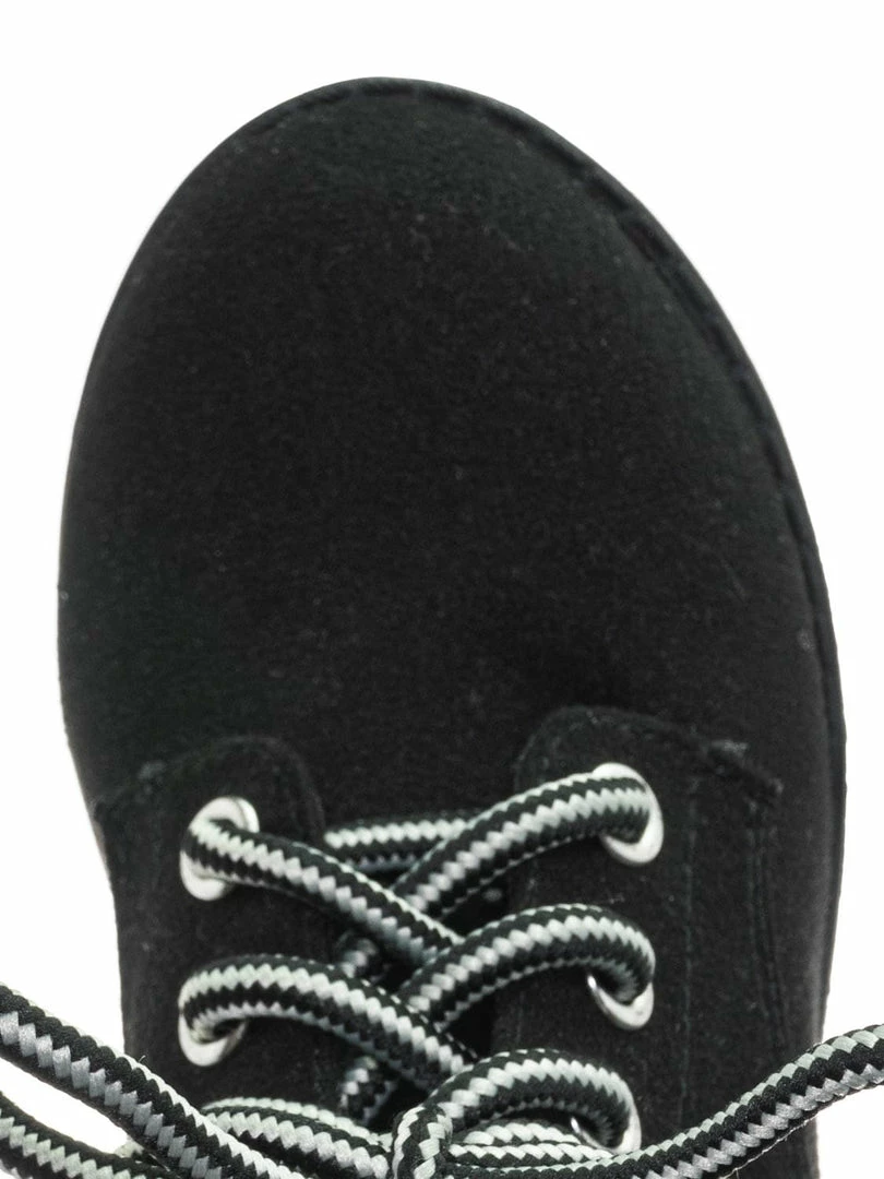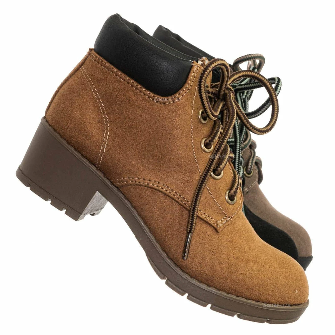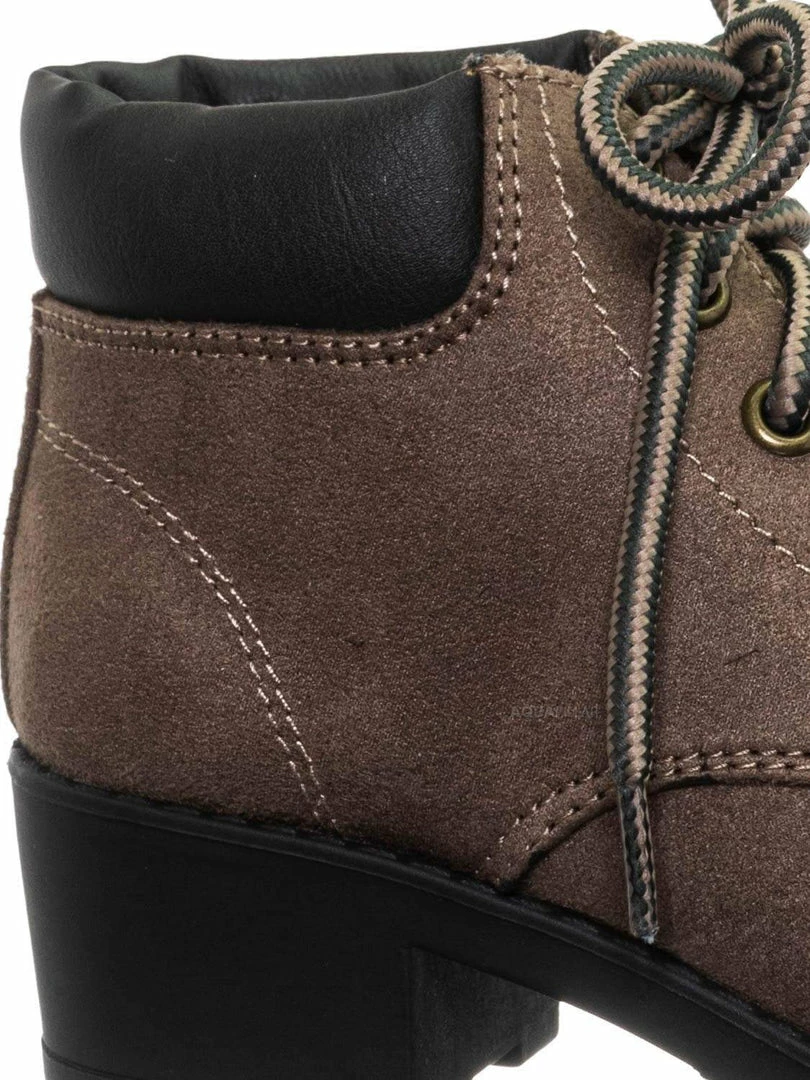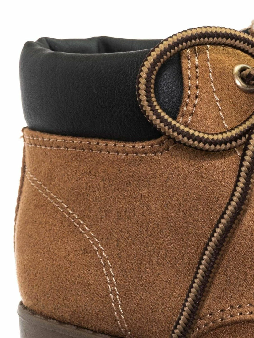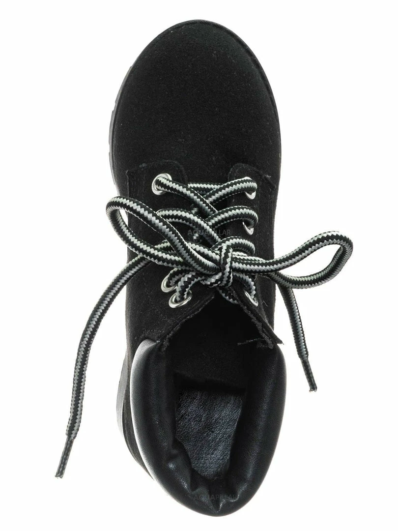 Product Detail : These boots for children features a classic work boots silhouette, ankle height shaft, padded collar, chunky block high heel, threaded lug sole, full frontal lace up closure and lightly padded insole.
