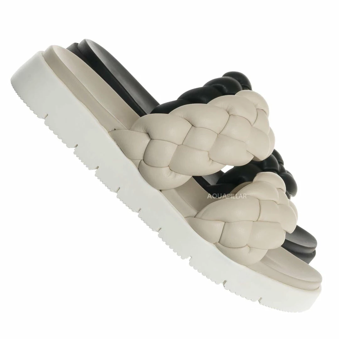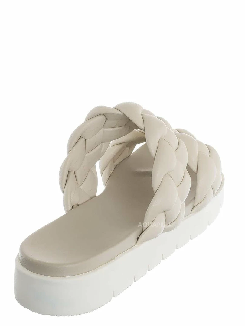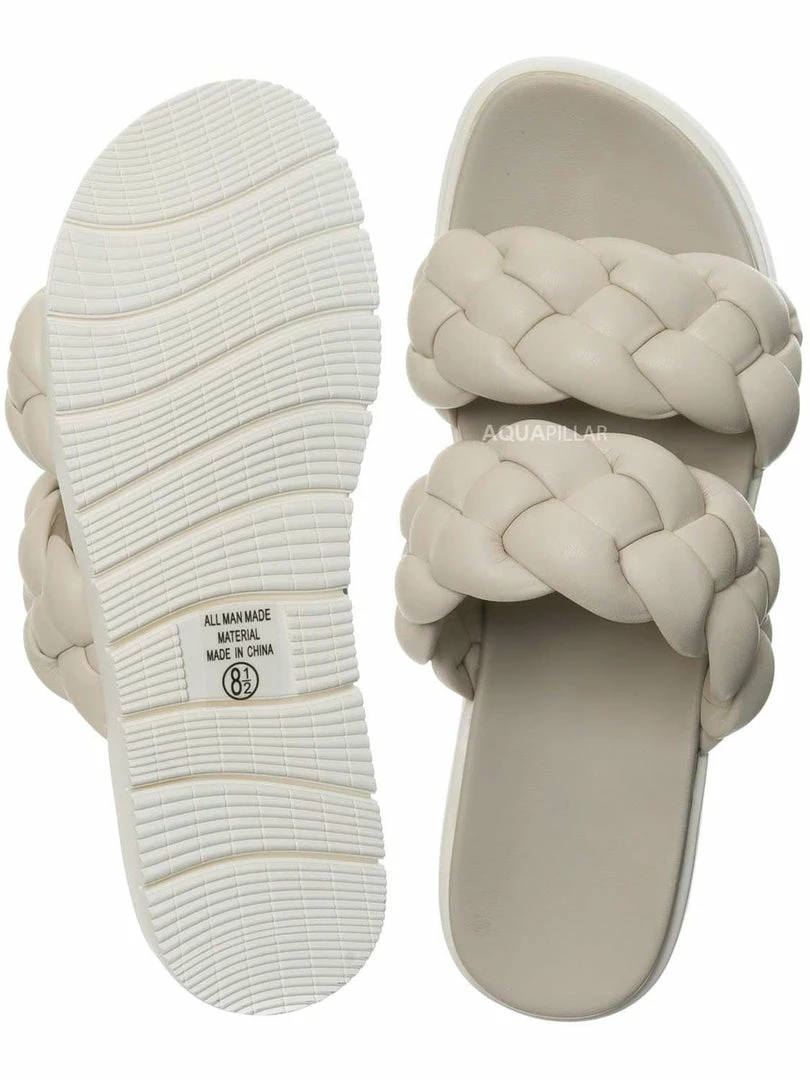 Product Detail : This slide features a comfortable molded footbed insole with a thick platform for extra comfort. There is a double strap with a puffy braid design.