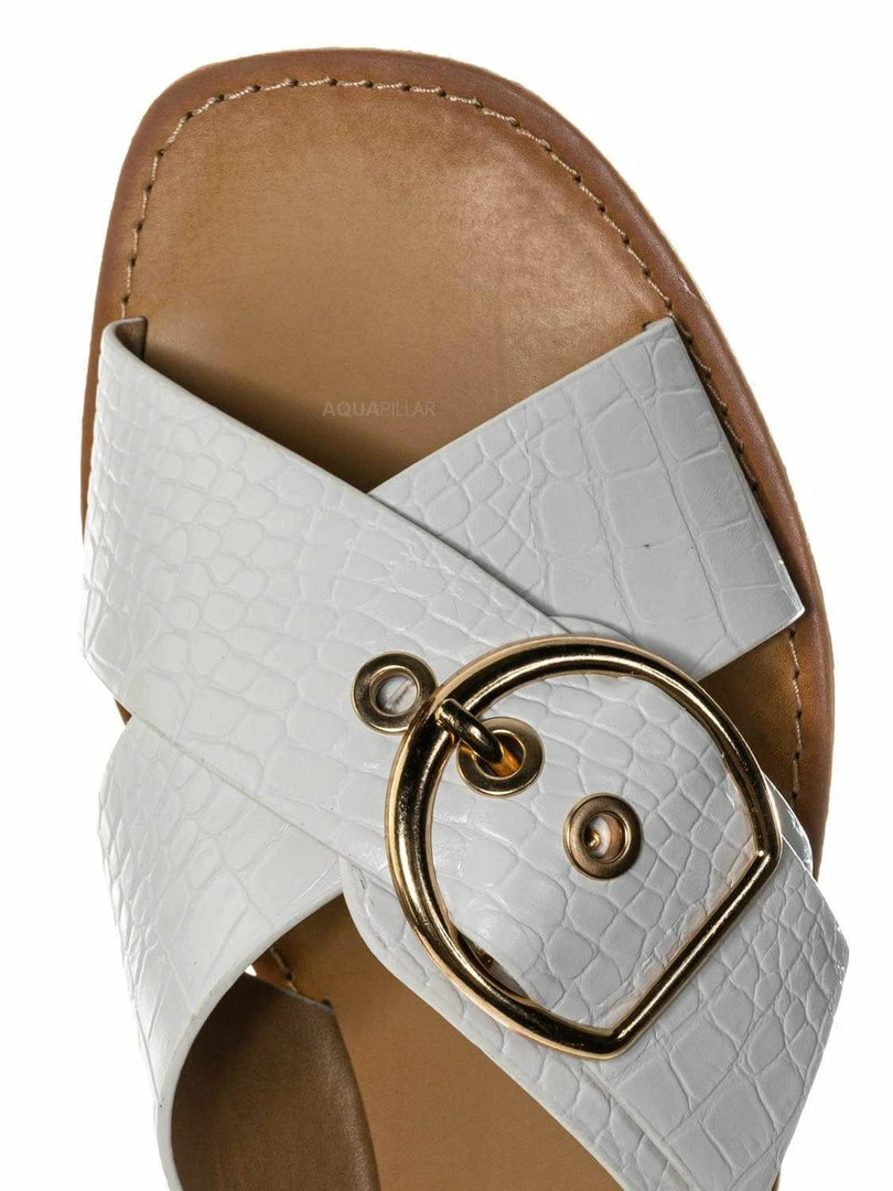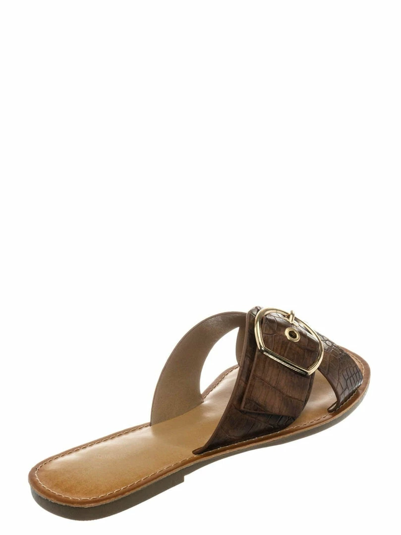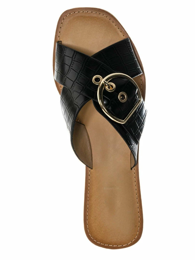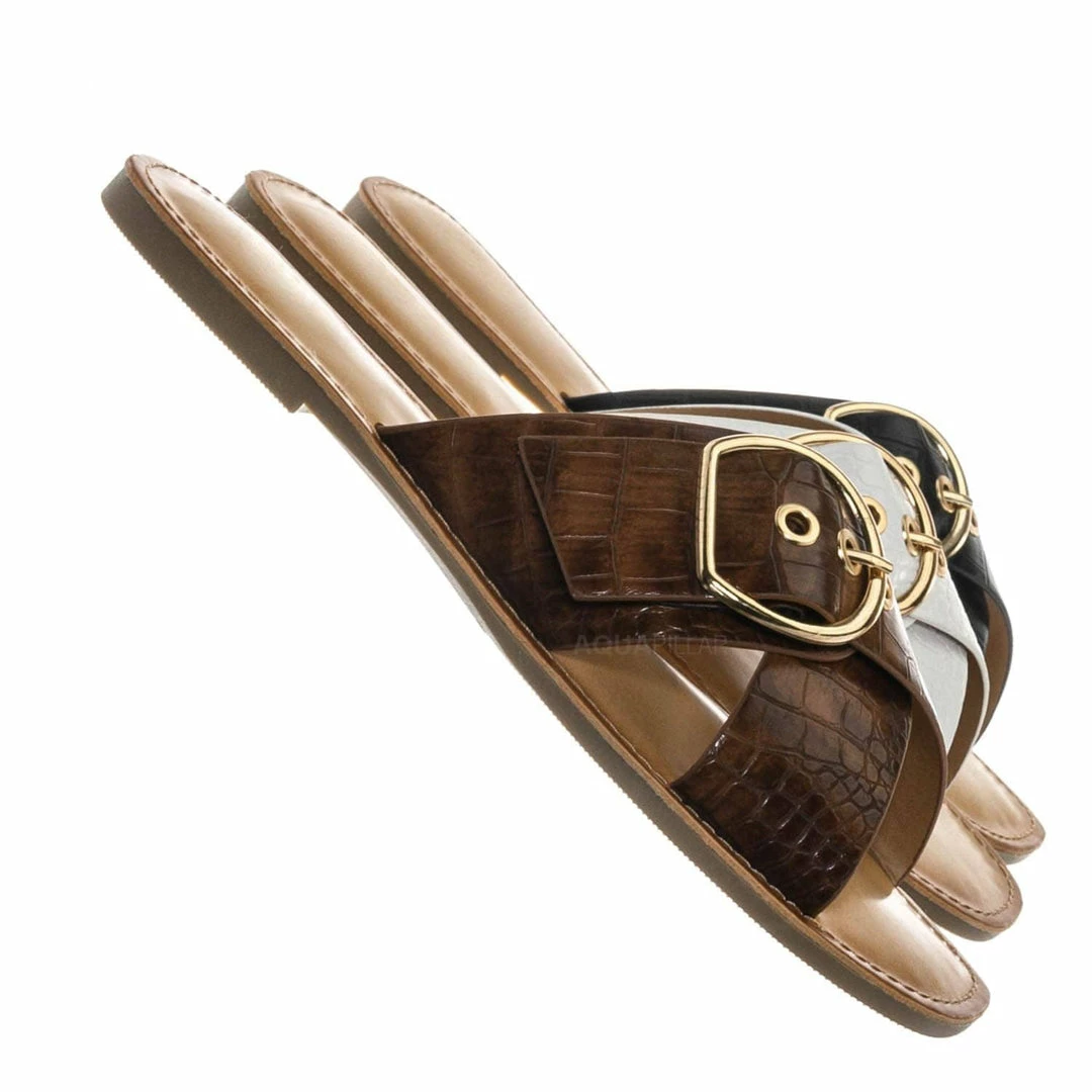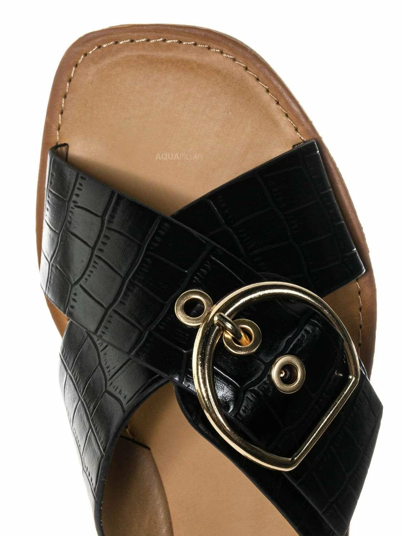 Product Detail : These slippers features a slide in construction, double X-strap upper, decorative buckle detail, crocodile embossed strap, vintage stained insole and lightly padded insole.