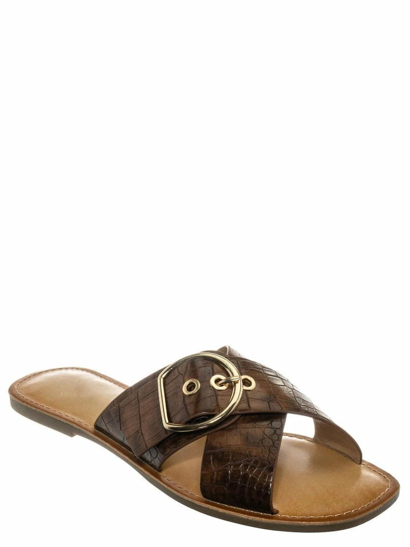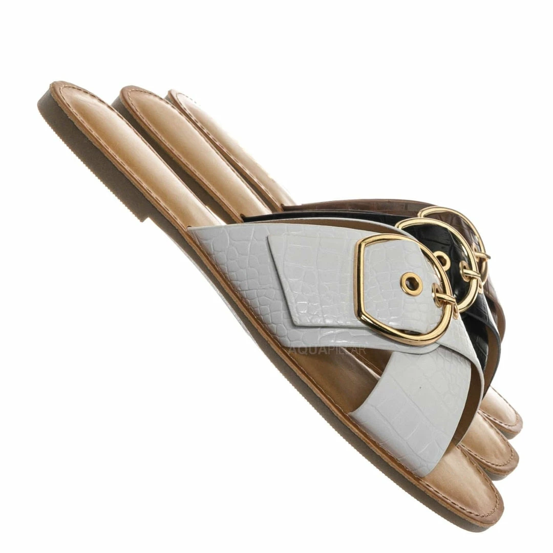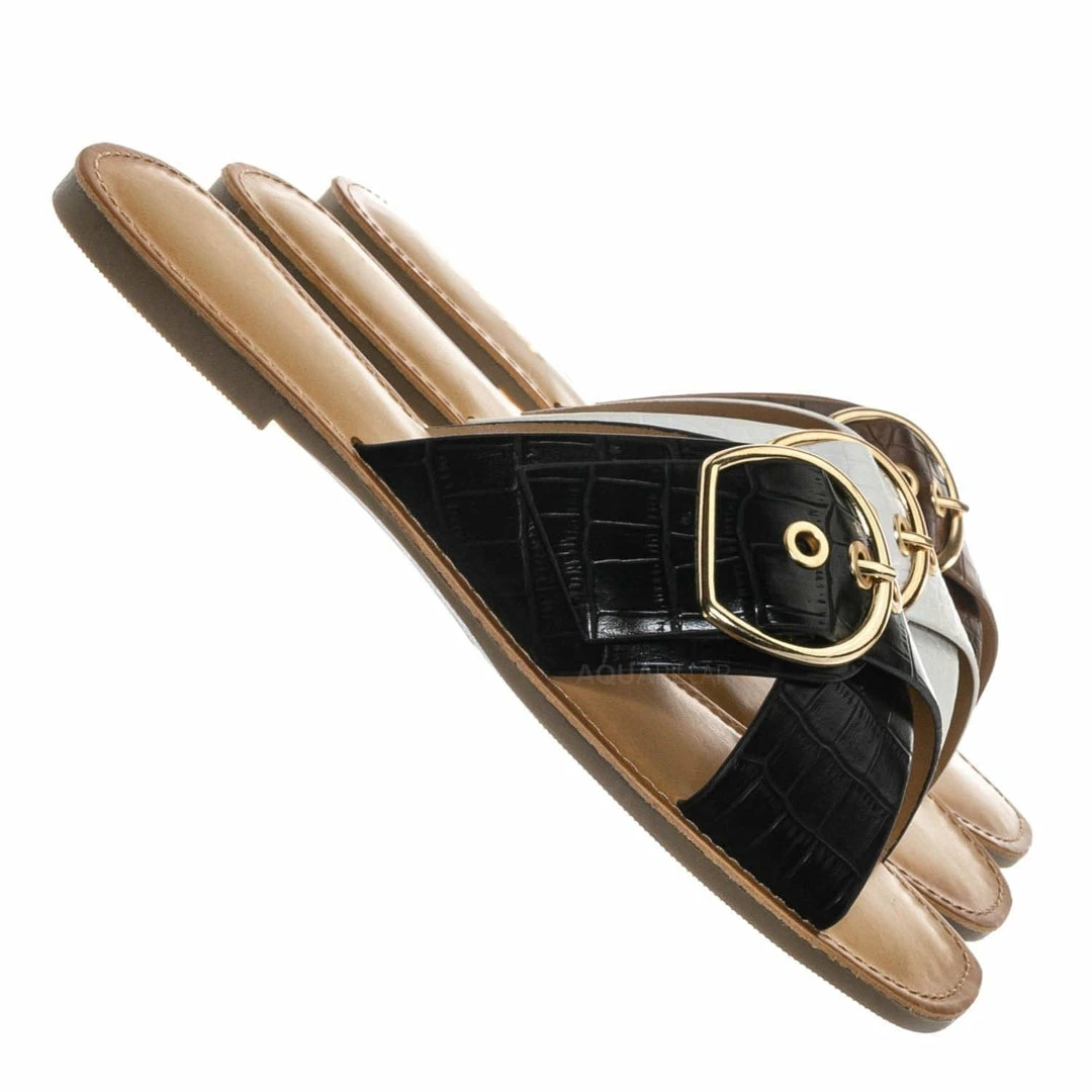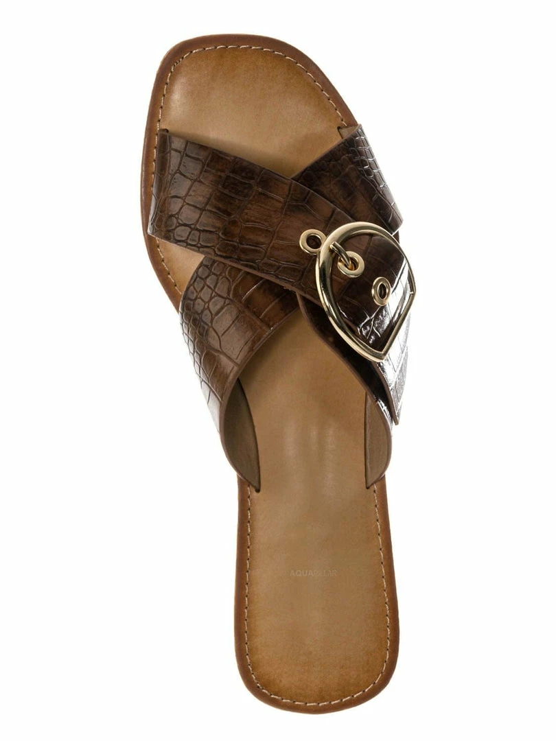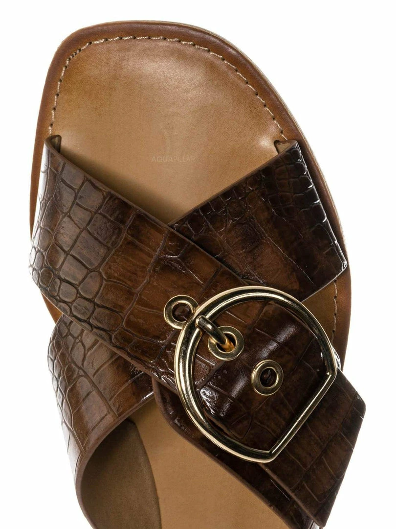 Product Detail : These slippers features a slide in construction, double X-strap upper, decorative buckle detail, crocodile embossed strap, vintage stained insole and lightly padded insole.