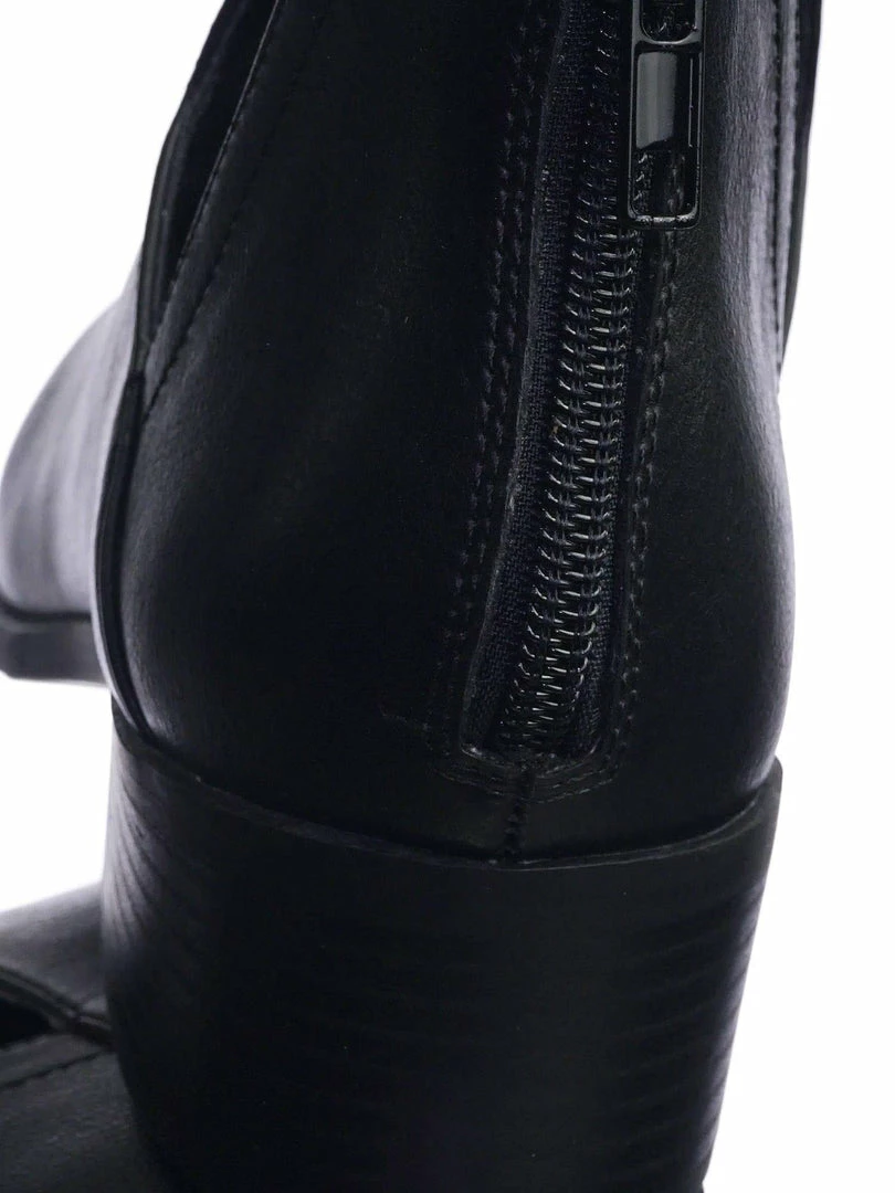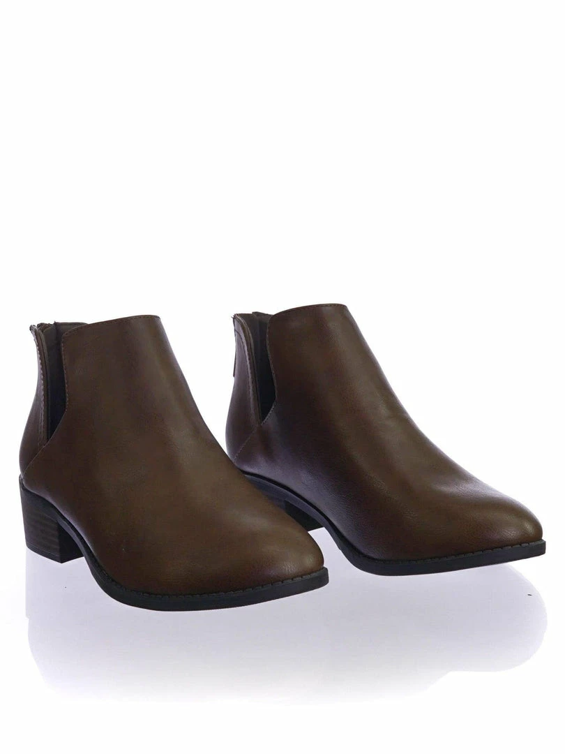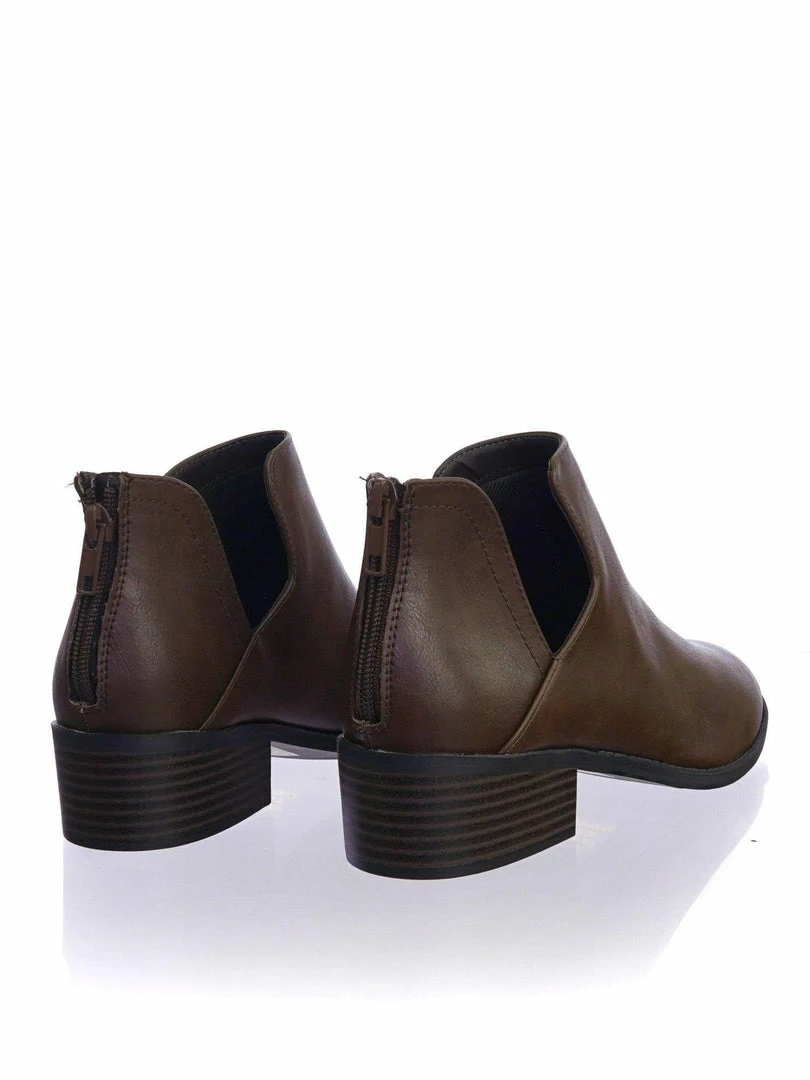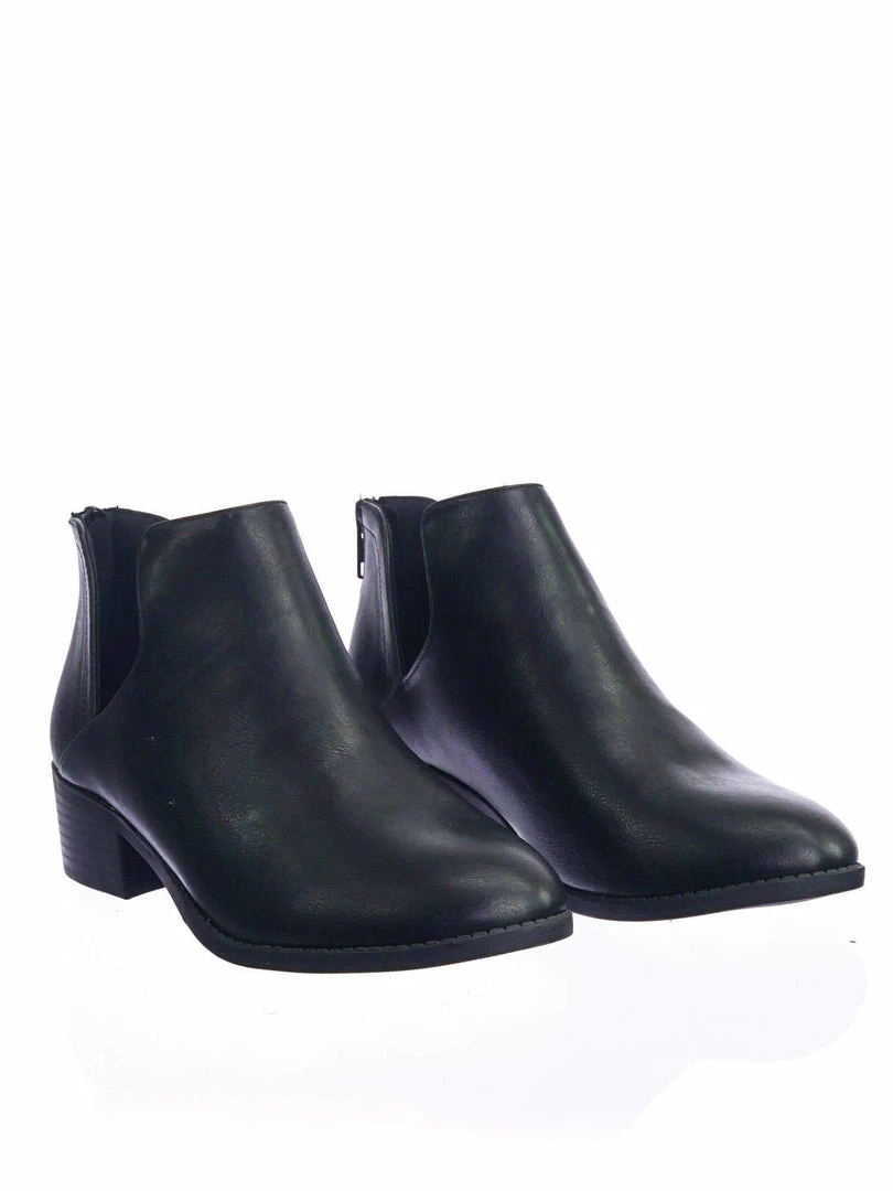 These ankle booties features almond toe, chunky stack block heel, rear zipper closure, double side cutout and lightly padded insole.