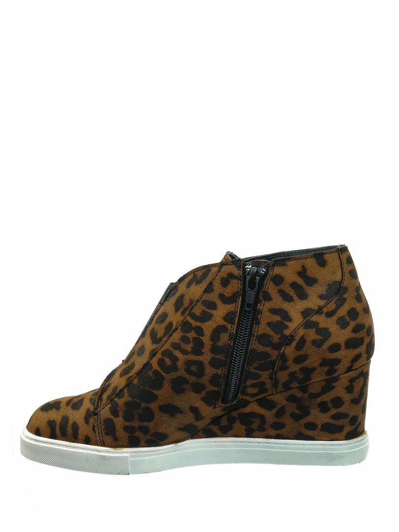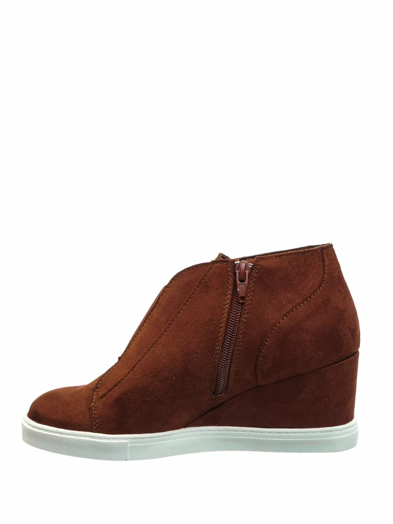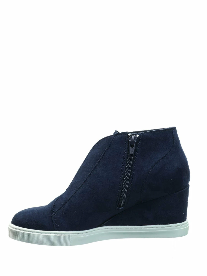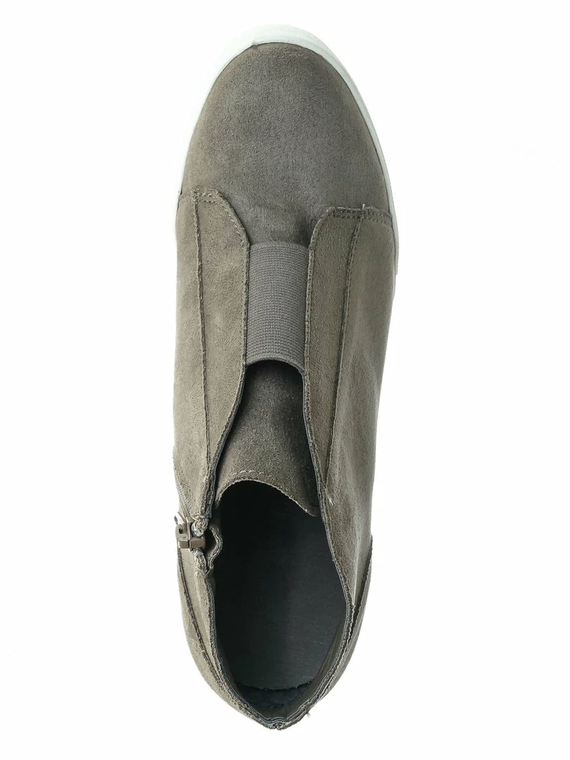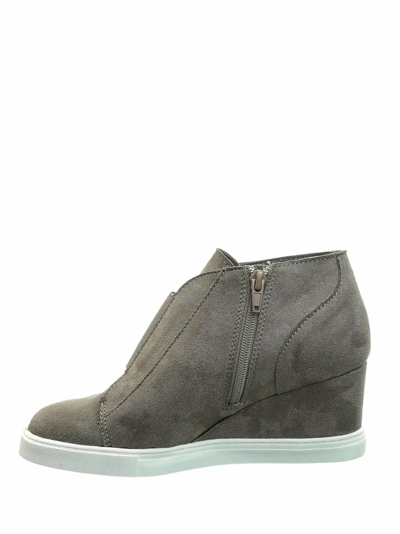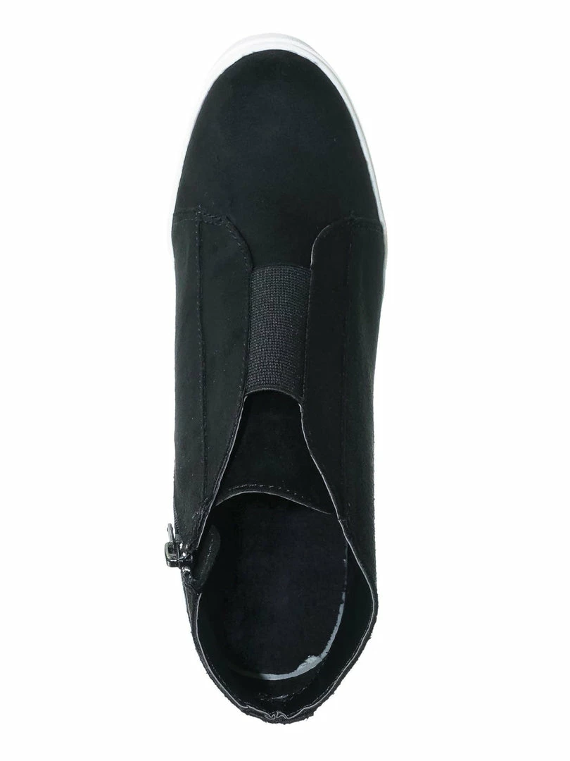 Product Detail : These slip on sneakers features a hidden wedge, white rubber platform outsole, rounded closed toe, front elastic and zipper closure and lightly padded insole.