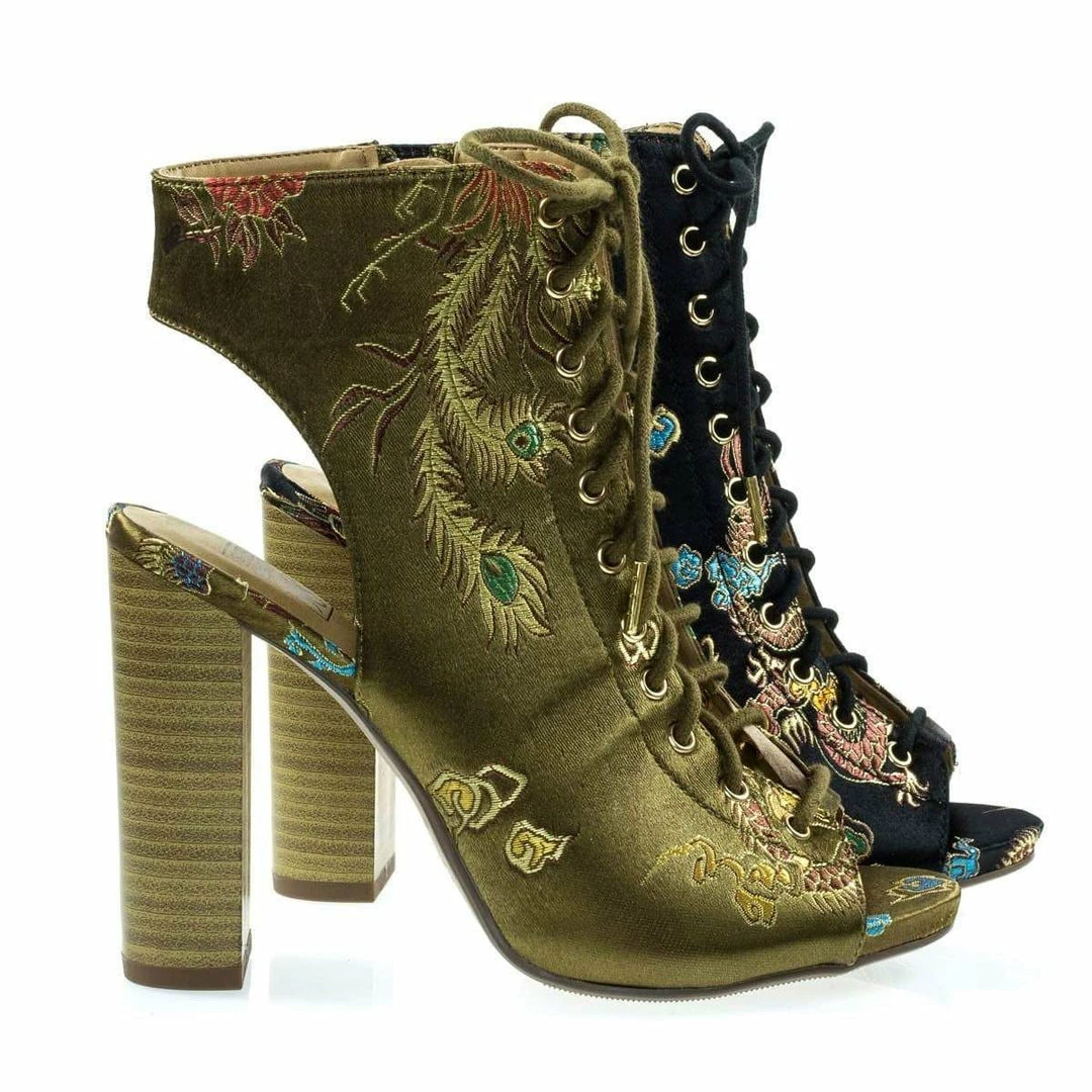 About This Shoes :Straps on these military inspired lace up bootie on towering high half moon block heel, stacked prints on heel, opened heel, peep toe opening, side zipper closure, shimmering satin upper, colorful oriental imperial phoenix feather embroidery.