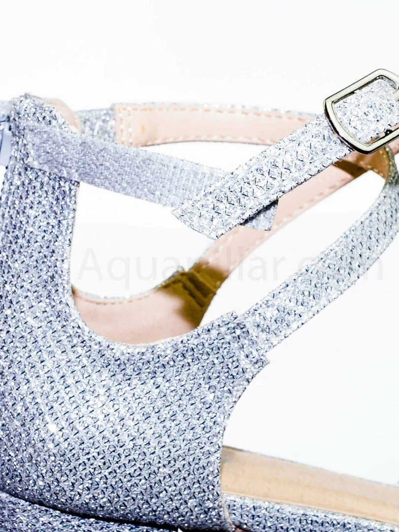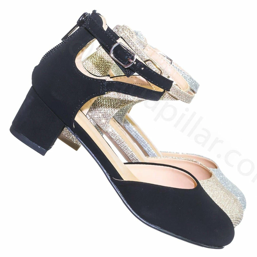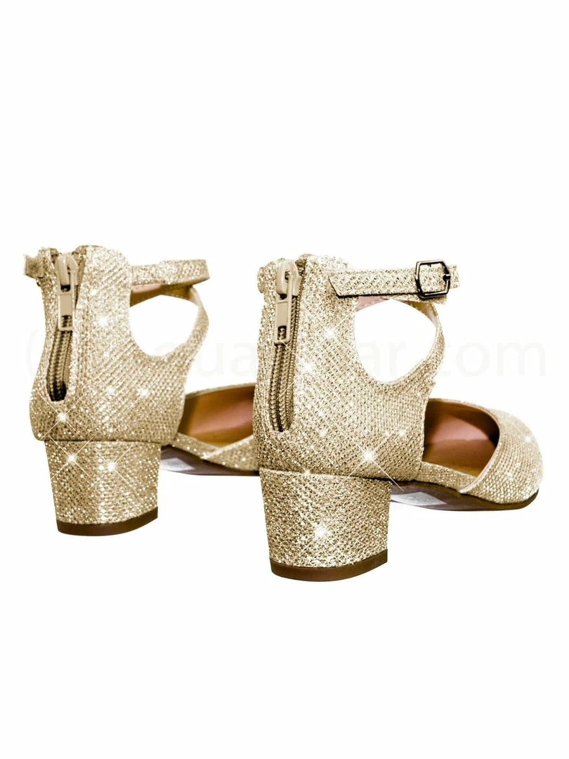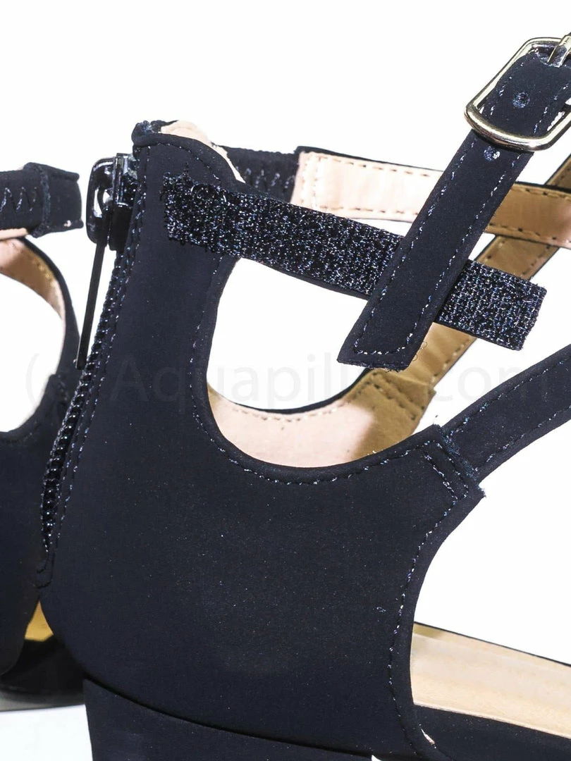 Product Detail : These sandals features a low block heel, closed heel counter, double cross strap adjustable ankle strap, the buckles on the ankle strap is not a functional buckle but it’s a easily snap on hook and loop closure (see photo). The sandals is closed off by a zipper closure, rounded toe, double open shank and comes in glitter and micro suede nubuck material