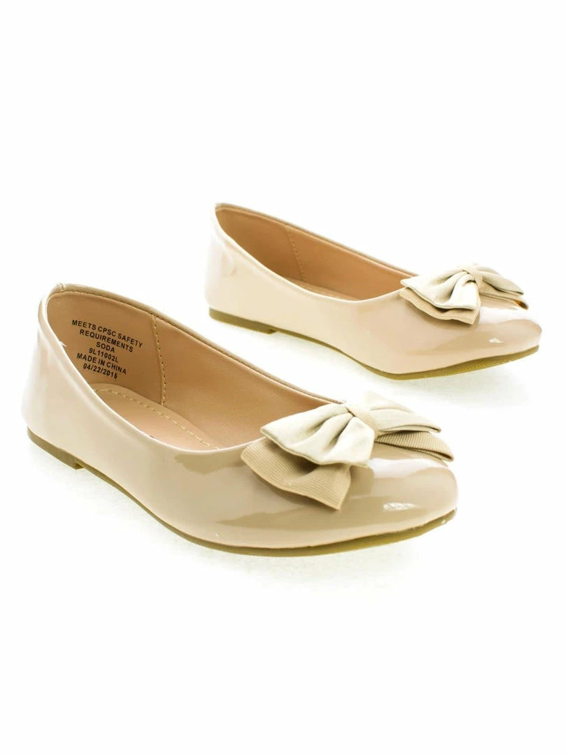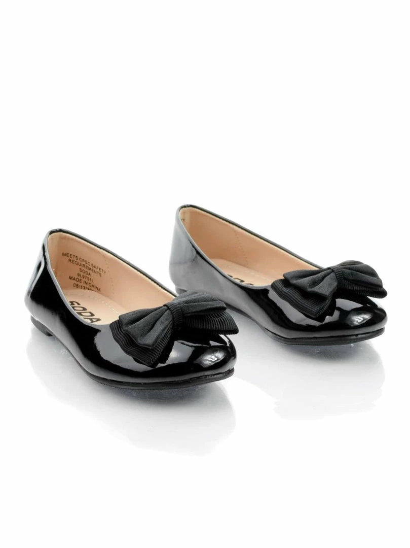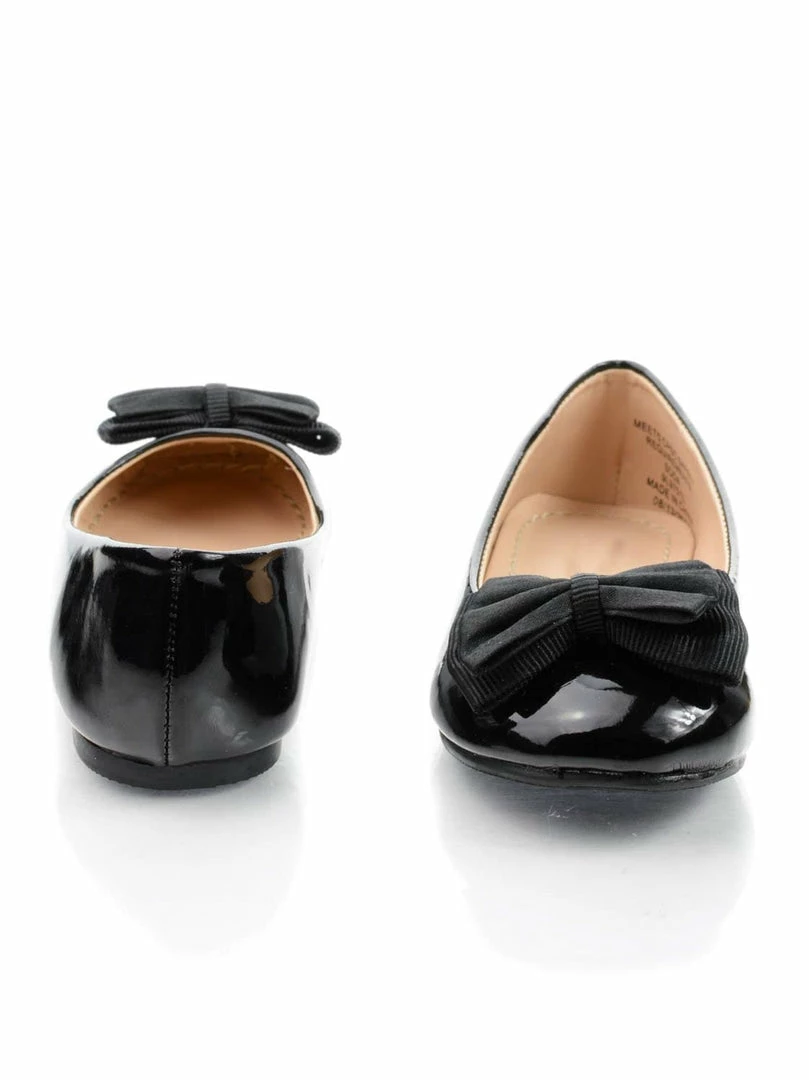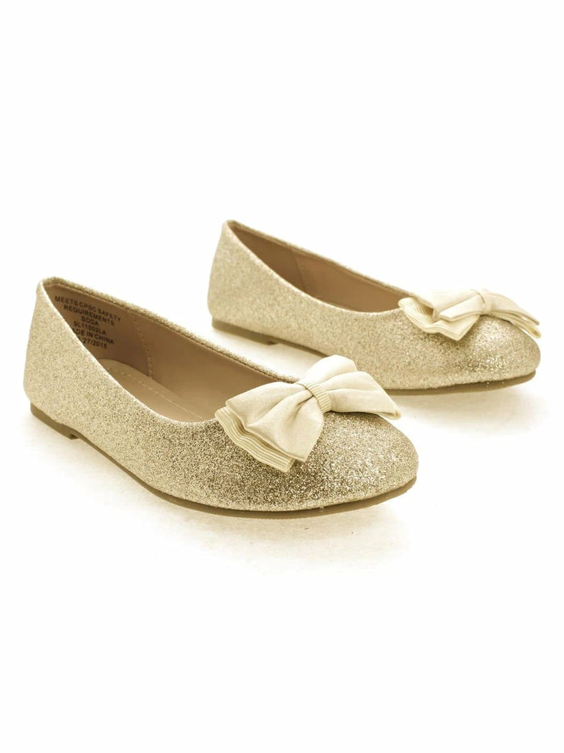 Product Detail : These kid’s size bow feature a rounded toe, a decorative bow near the toe, flat heel, ballet flat silhouette and lightly padded insole.