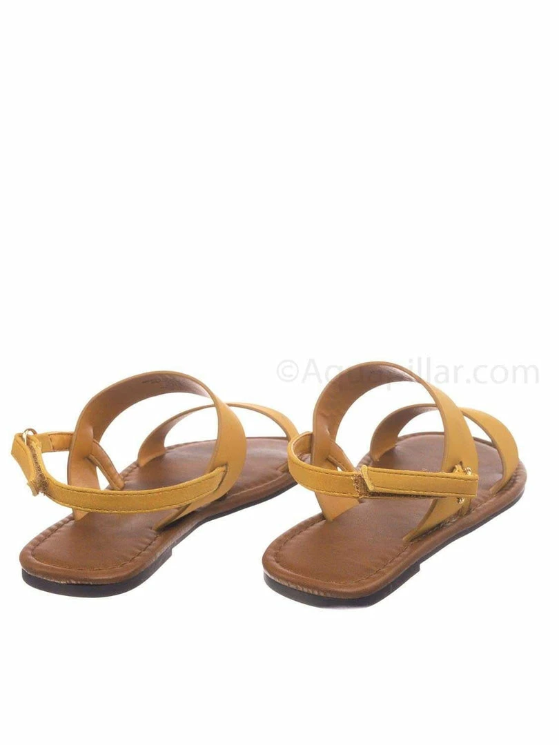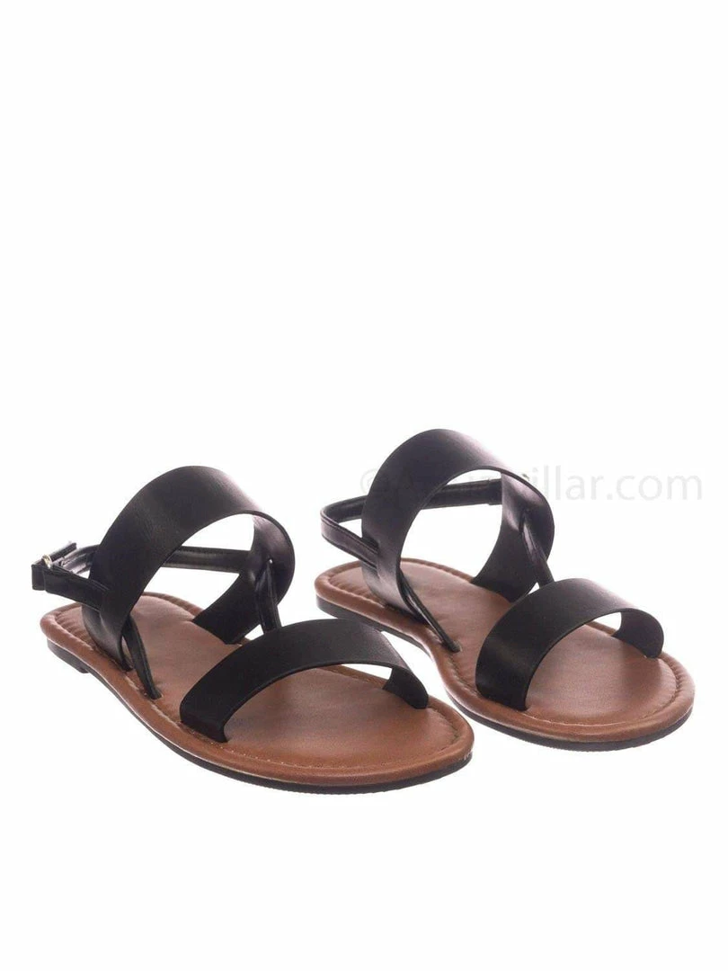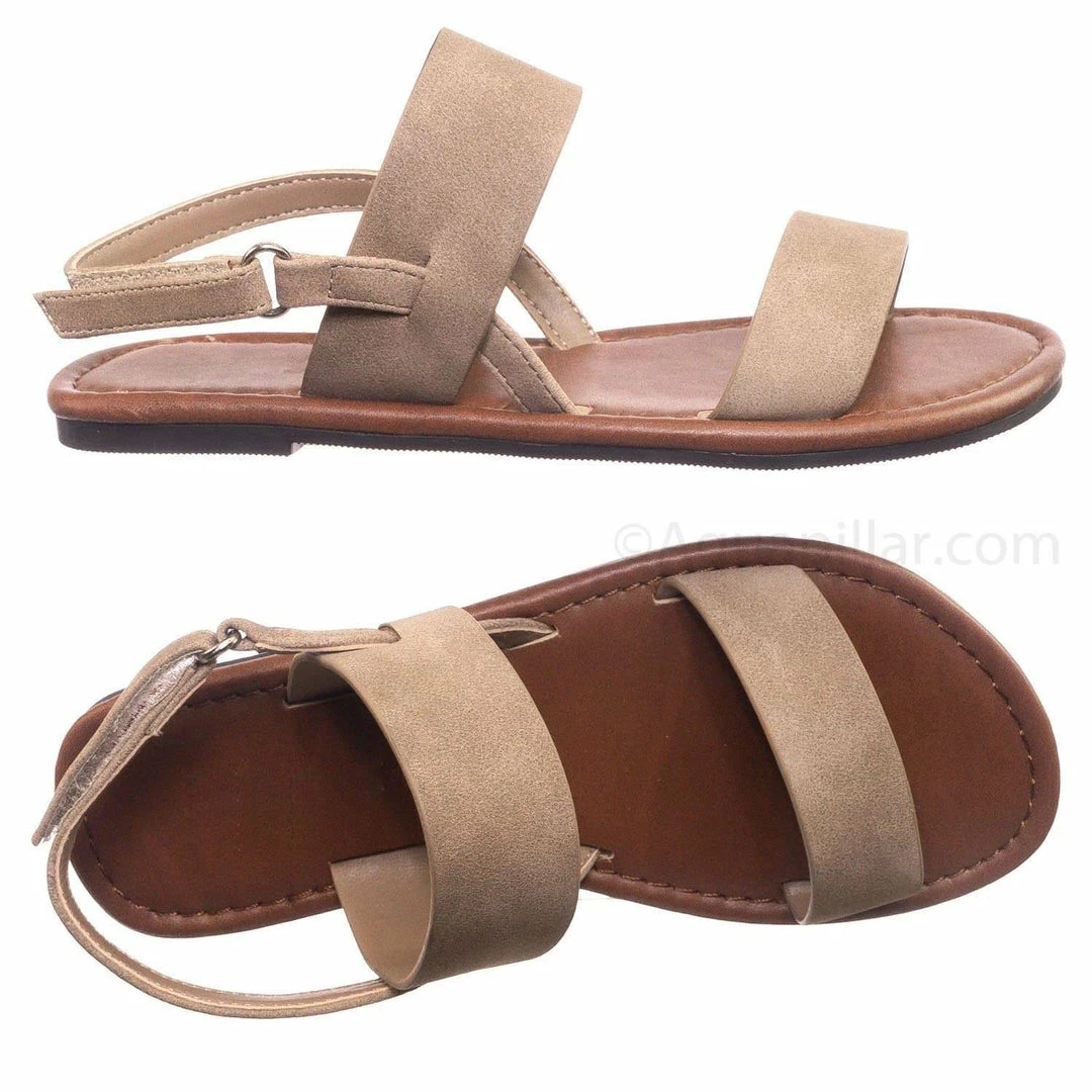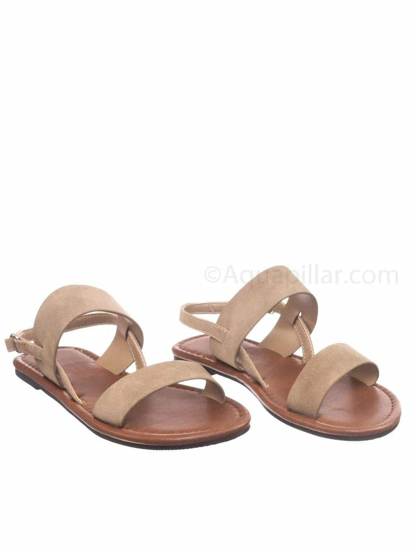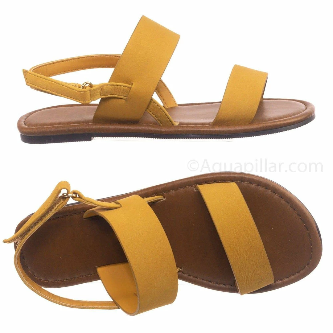 Product Detail : These flat sandals are in children’s sizes featuring double foot strap, sling back strap with hook & loop closure, lightly padded insole.