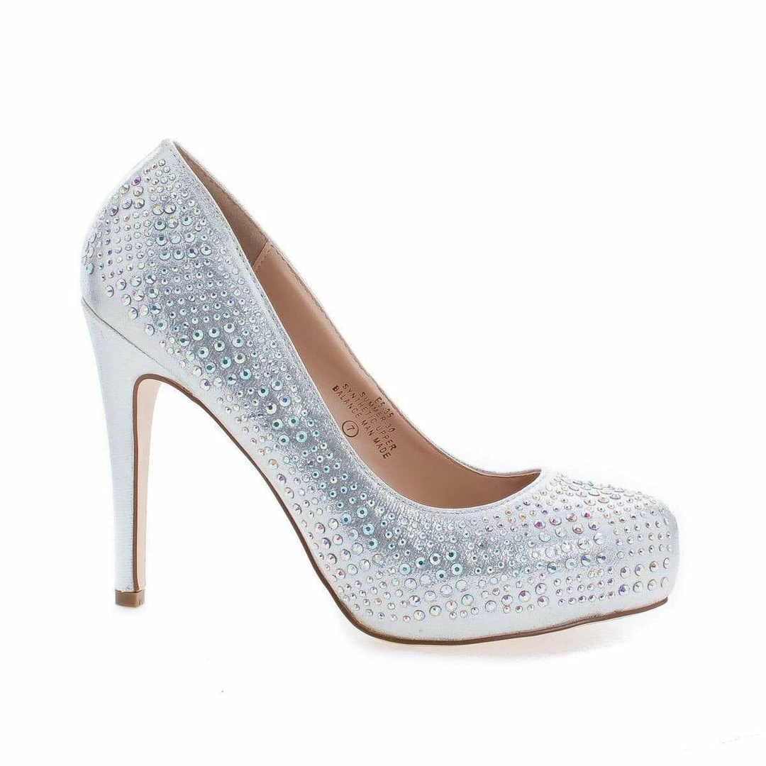 Shimmer and doll yourself up with these sparkling rhinestone stiletto heel dress pumps, featuring a pointed toe, glitter, sparkling rhinestones, a slightly padded insole for comfort, an approximate 0.5 inch platform for extra comfort, and an approximate 4.5 inch high stiletto heel. (Please note that these measurements are based on a size 7). Available in Silver, Gold, etc. All man made materials. By Aquapillar.