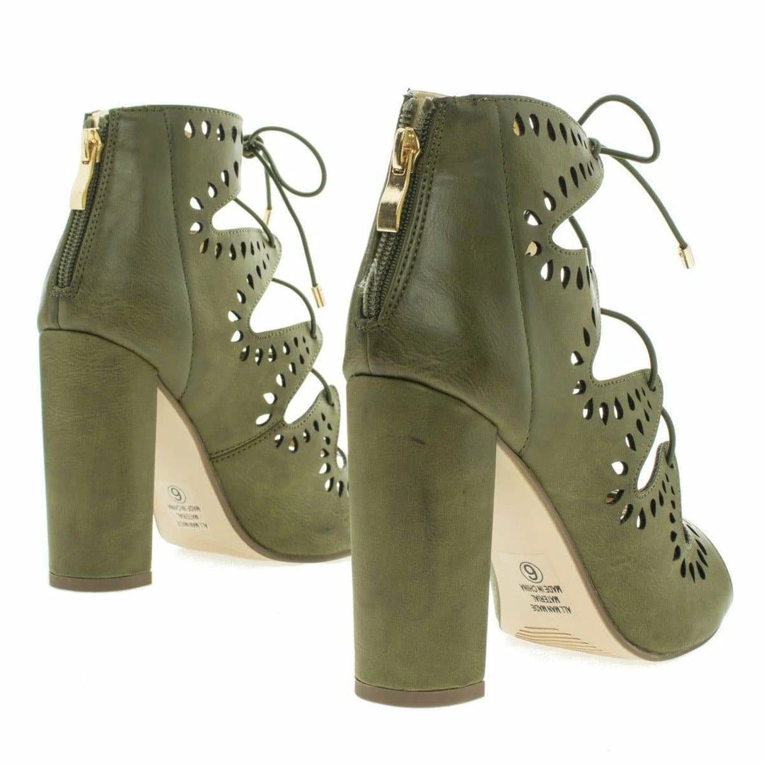 Make heads turn with these laser geometric cut out lace up high heel sandals, featuring an open toe, contrast stitching, adjustable laces, laser perforated geometric cut out design, a back center zipper for easy wear and closure, a slightly padded insole for comfort, and an approximate 4 inch high heel. (Please note that these measurements are based on a size 7). Style fits true to size. Available in Black, Sand (Beige), Khaki (Green), etc. All man made materials. Why buy expensive brand name shoes when you can get cheap (in price) alternative with good quality, with this style you can afford to have beautiful styles without compromising the quality or the price. By Aquapillar
