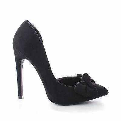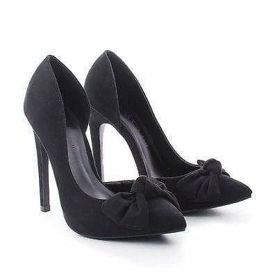 Add a sass of class to your outfit with these classic stiletto pumps, featuring a pointy toe, contrast stitching, a knotted bow by the toe area, a d’orsay look, a slightly padded insole for comfort, and an approximate 4.5 inch high stiletto heel. Available in Black, Taupe (Grey), etc. Style runs small, suggested to purchase a half size bugger. All man made materials. By Wild Diva Shoes. .