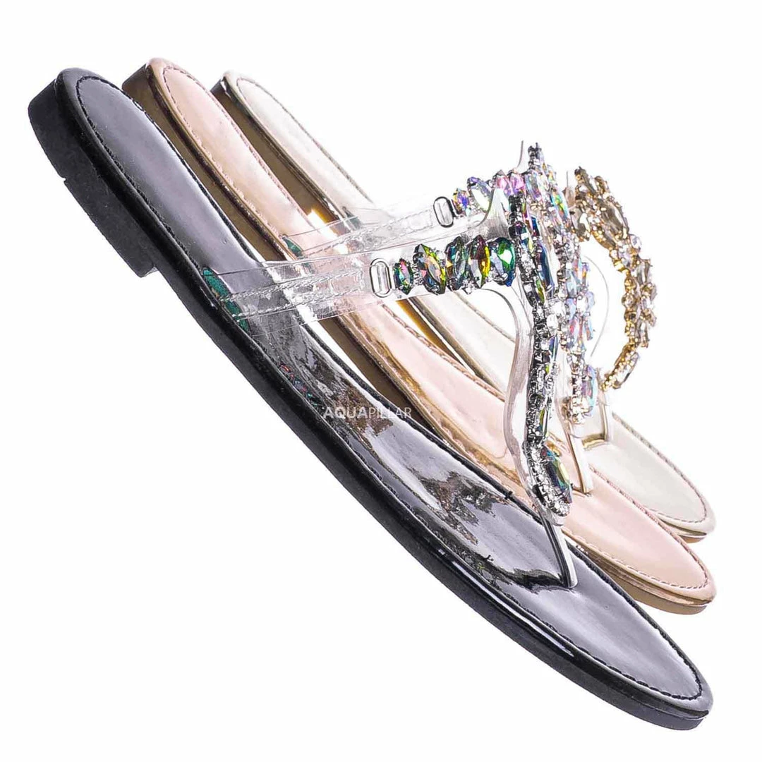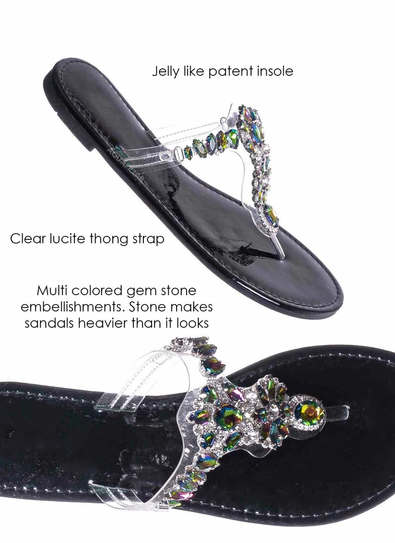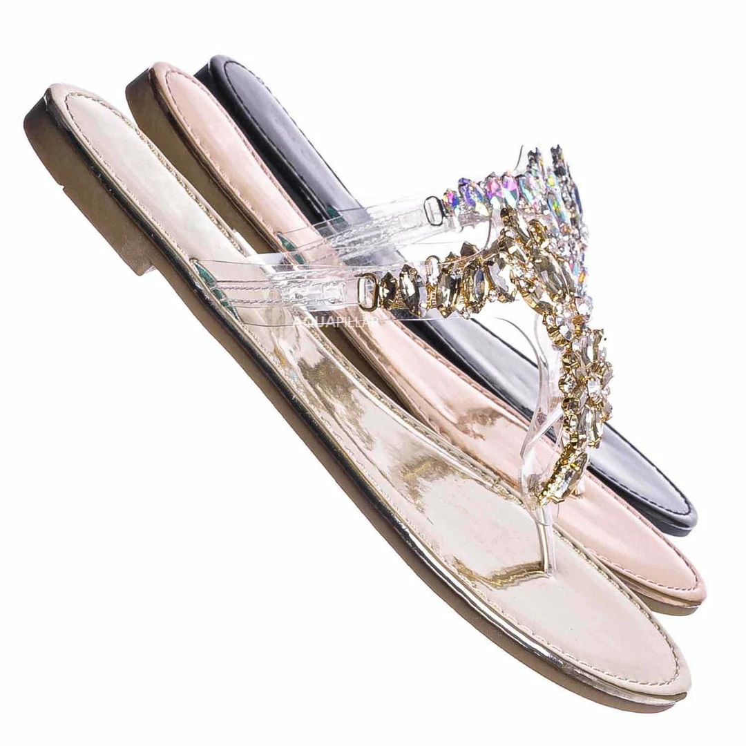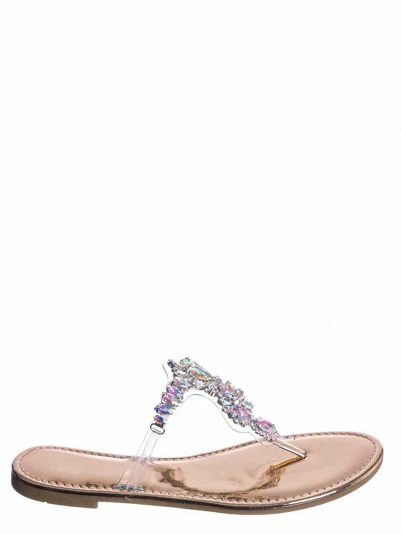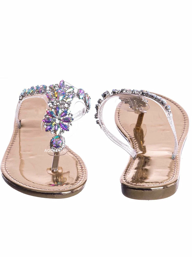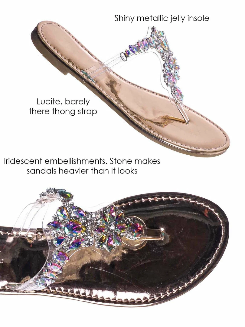 Product Detail: These slides feature a metallic flat lightly padded insole and thong strap. Fall in love with the clear lucite thong strap embellished in floral rhinestone crystals. The black features rainbow colored crystal, rosegold features a light pink/purple iridescent crystal and gold features gold crystals.
