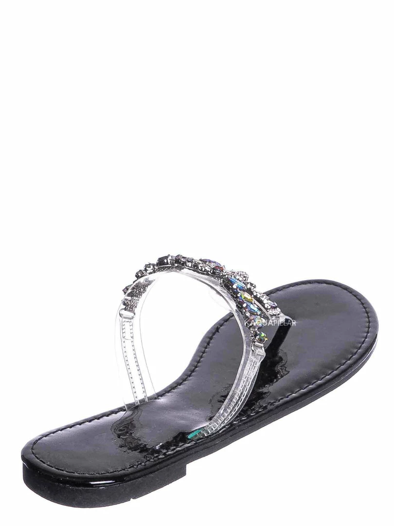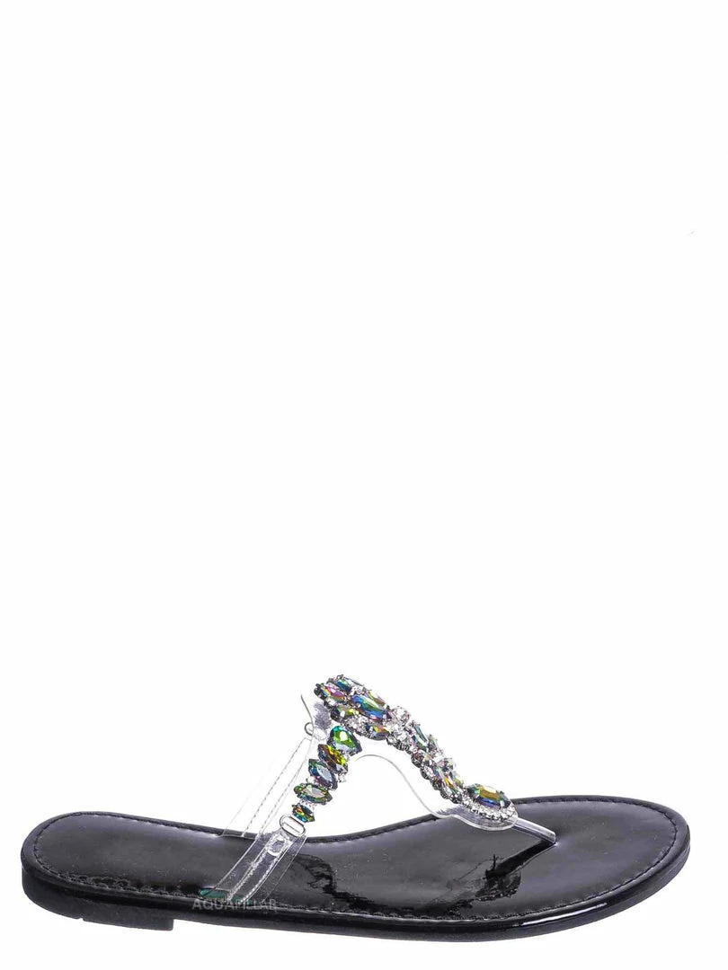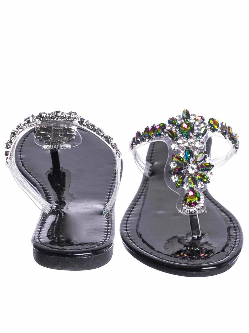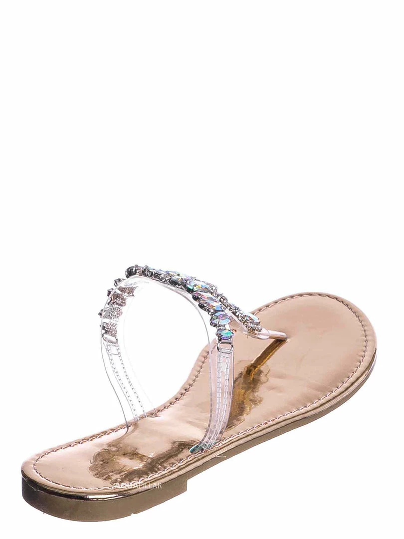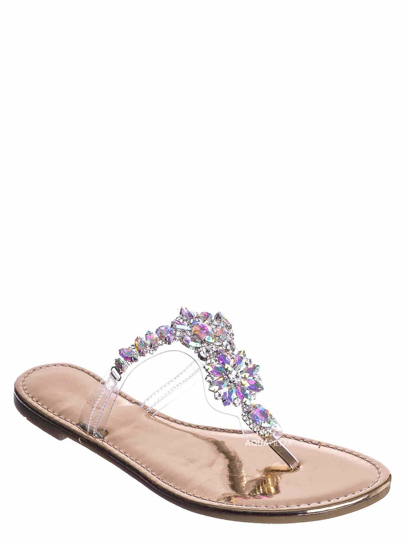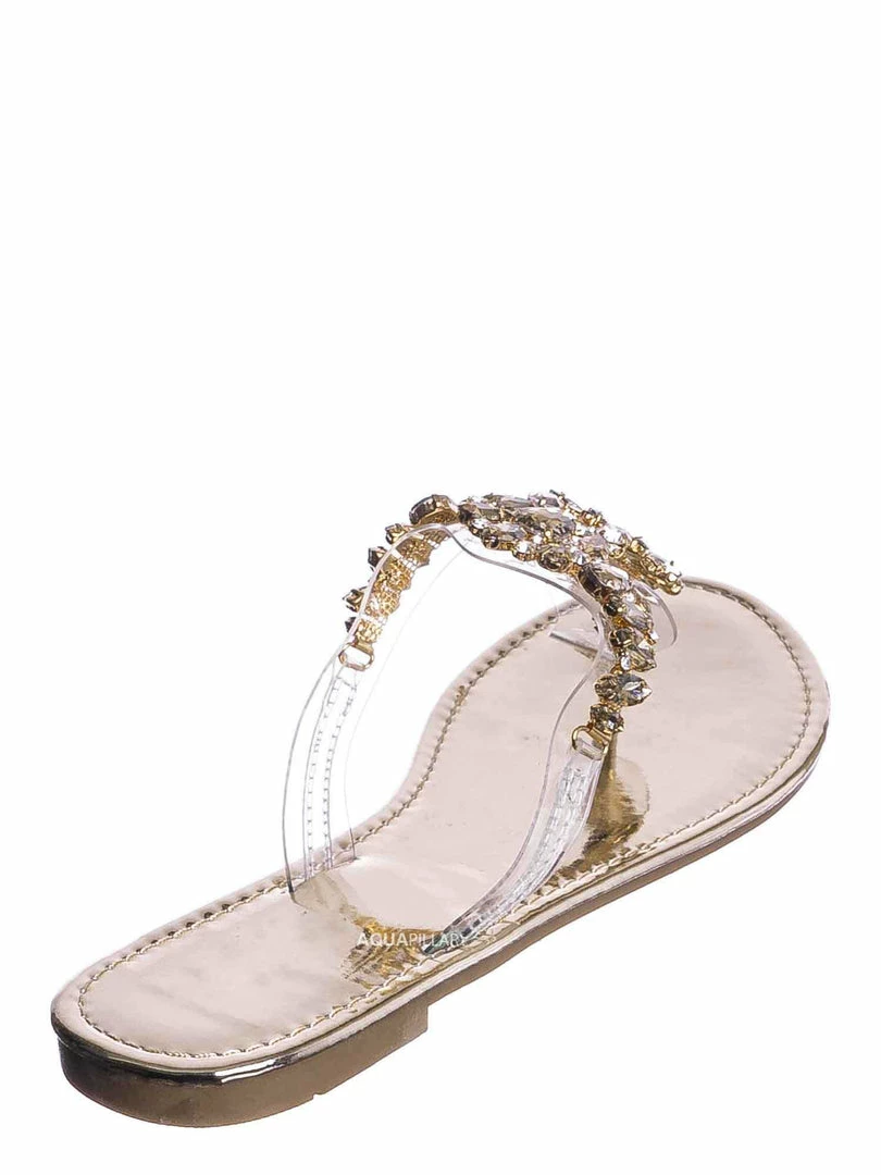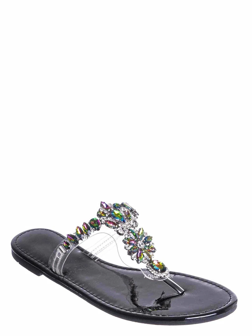 Product Detail: These slides feature a metallic flat lightly padded insole and thong strap. Fall in love with the clear lucite thong strap embellished in floral rhinestone crystals. The black features rainbow colored crystal, rosegold features a light pink/purple iridescent crystal and gold features gold crystals.