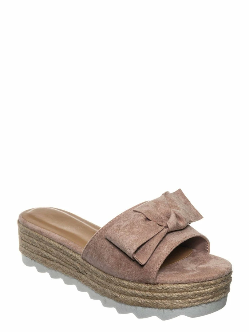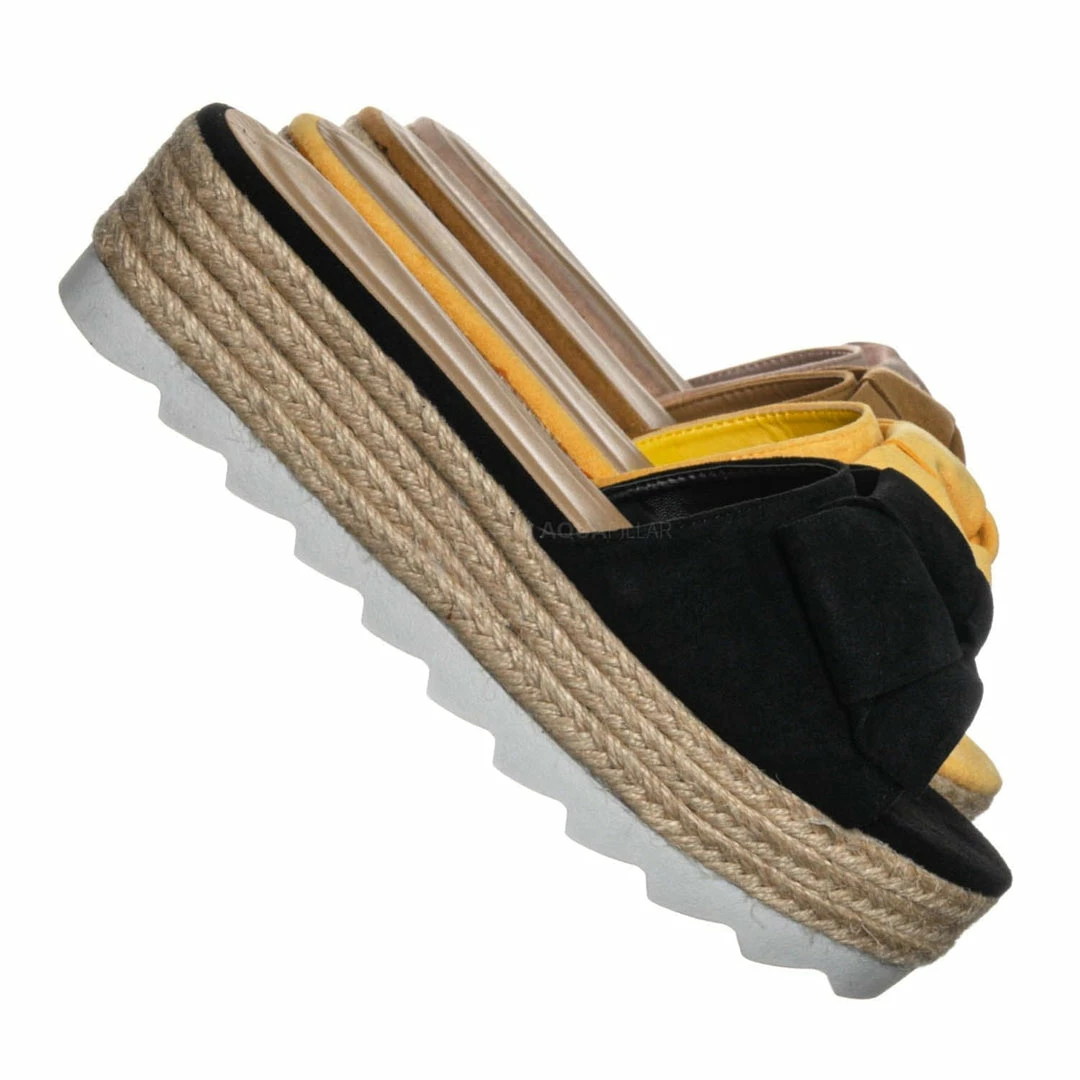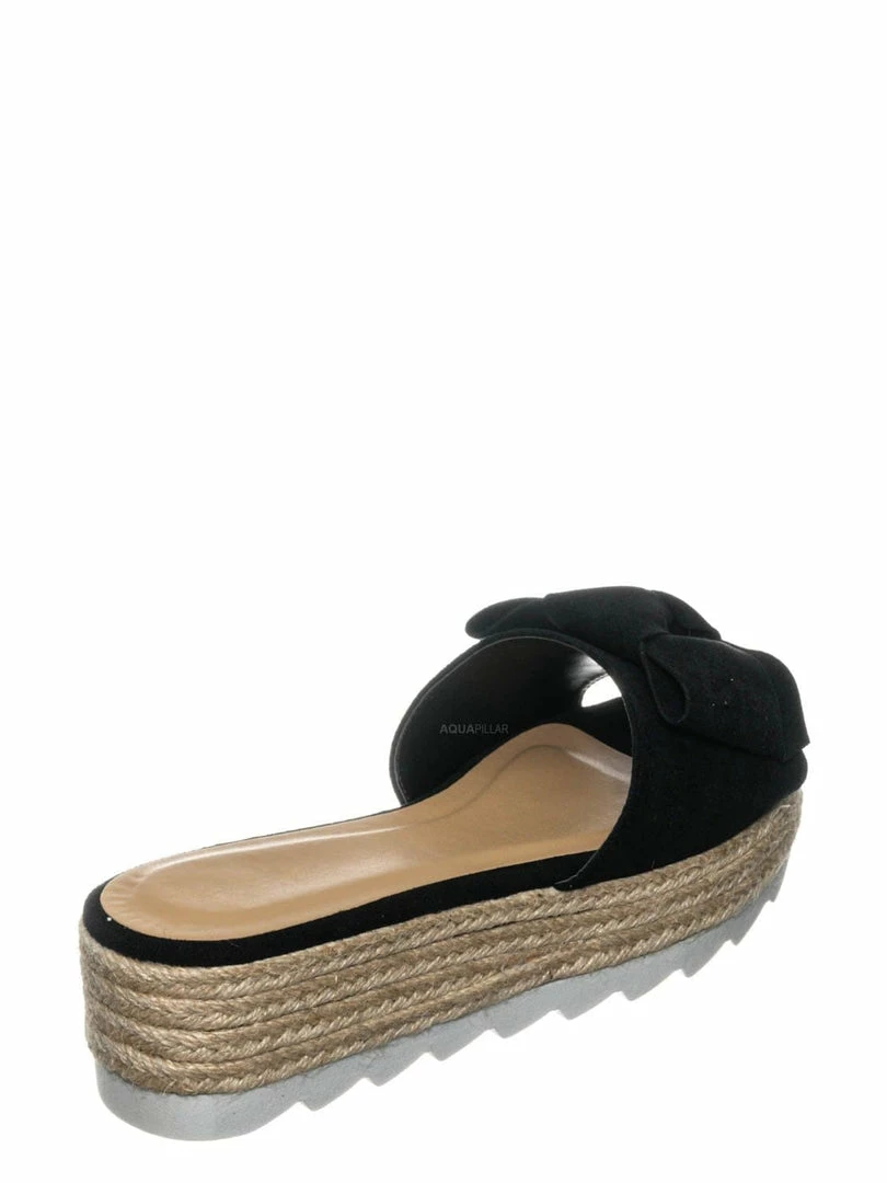 Product Detail : These sandals features a thick flat platform (flatform), espadrille jute rope wrapped platform, saw edge sharktooth rubber outsole, single vamp upper with bow ornamentation and slide in construction.