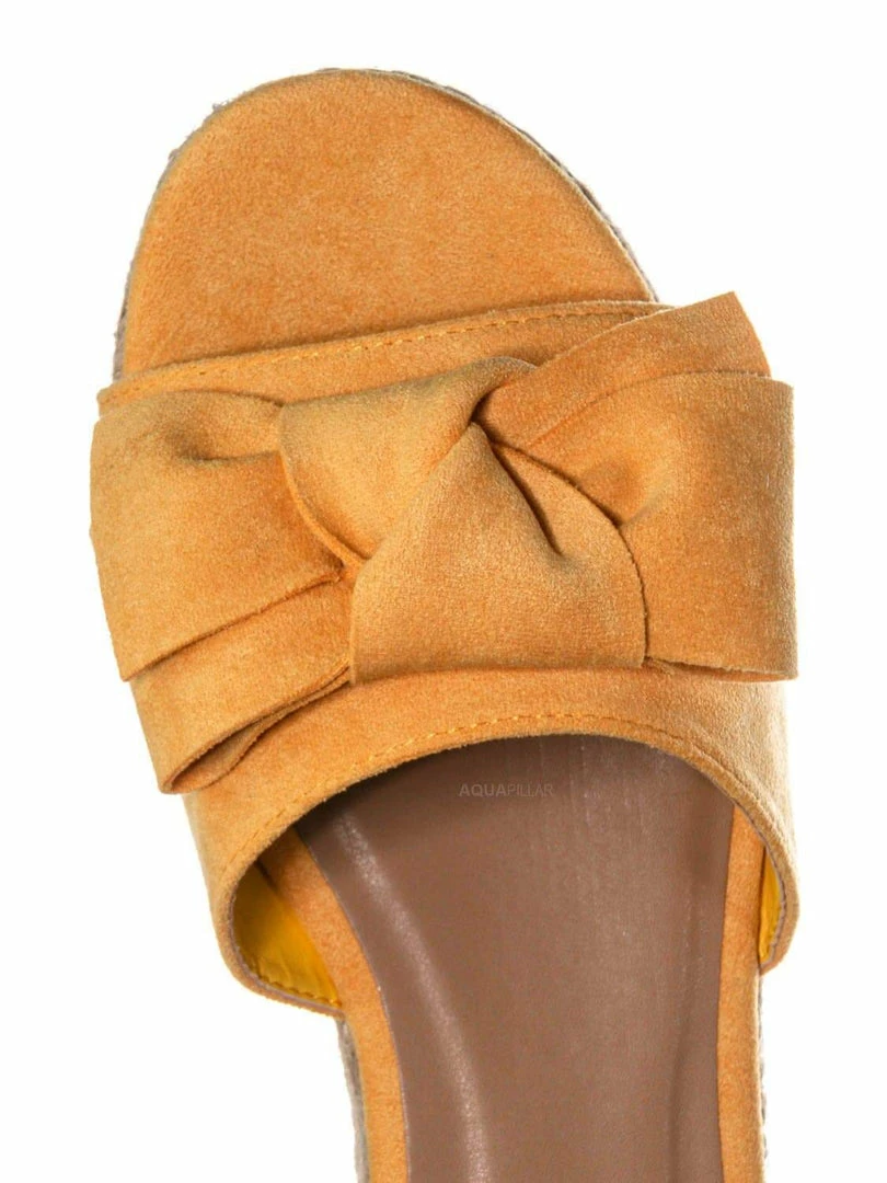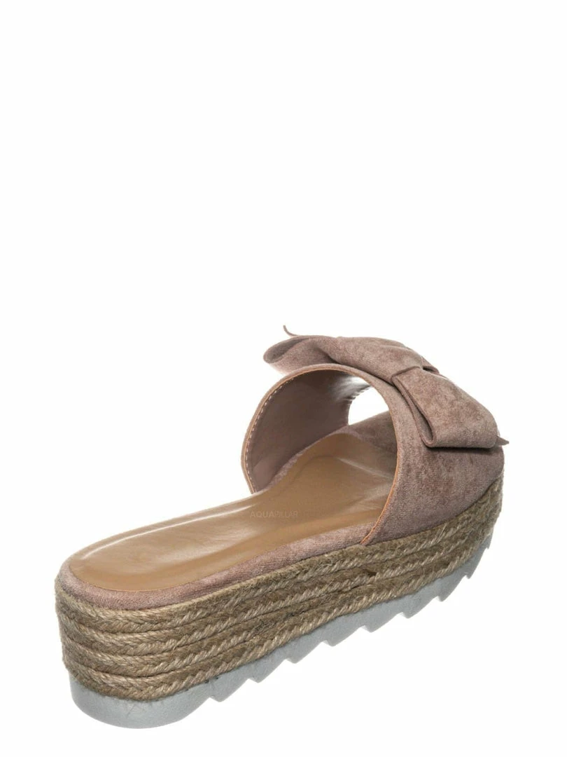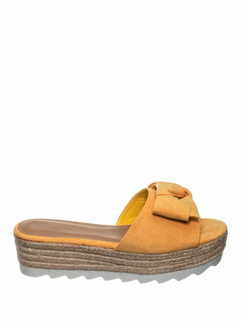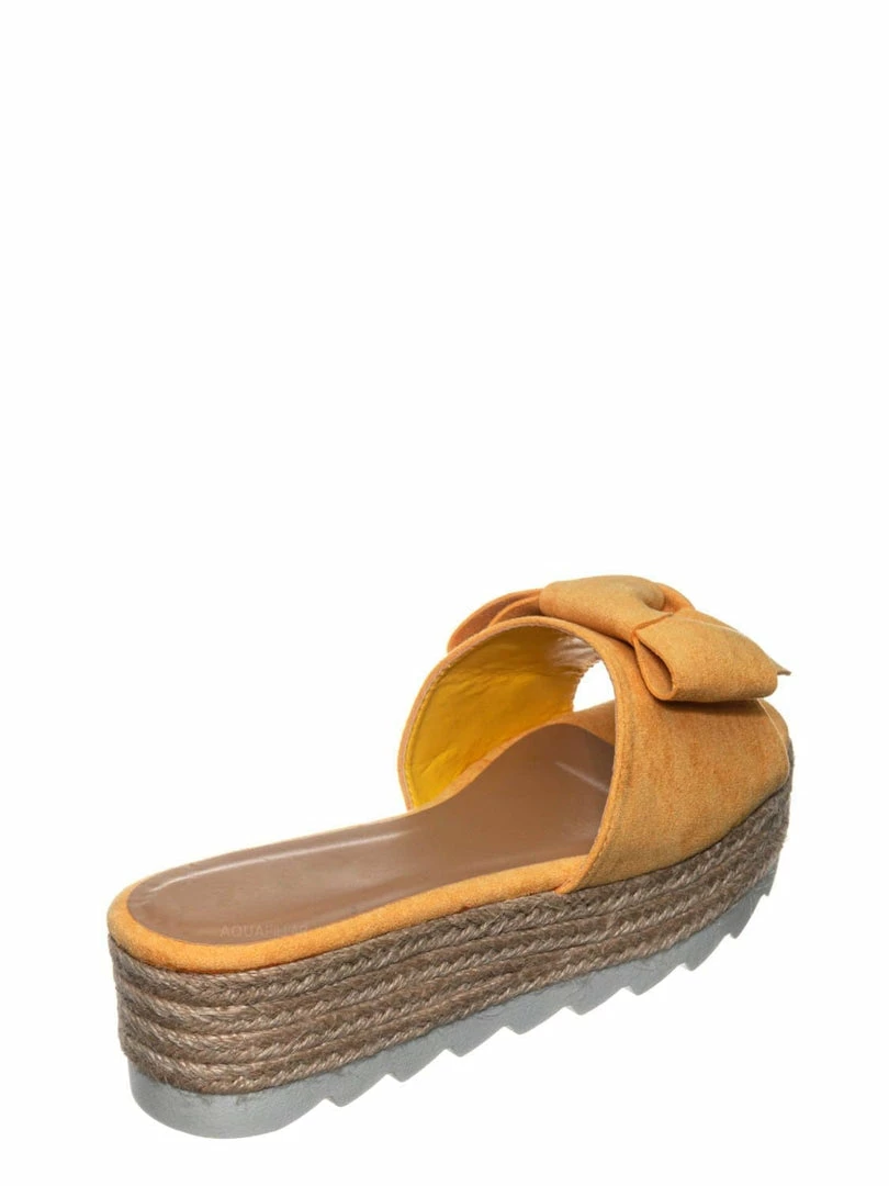Product Detail : These sandals features a thick flat platform (flatform), espadrille jute rope wrapped platform, saw edge sharktooth rubber outsole, single vamp upper with bow ornamentation and slide in construction.
