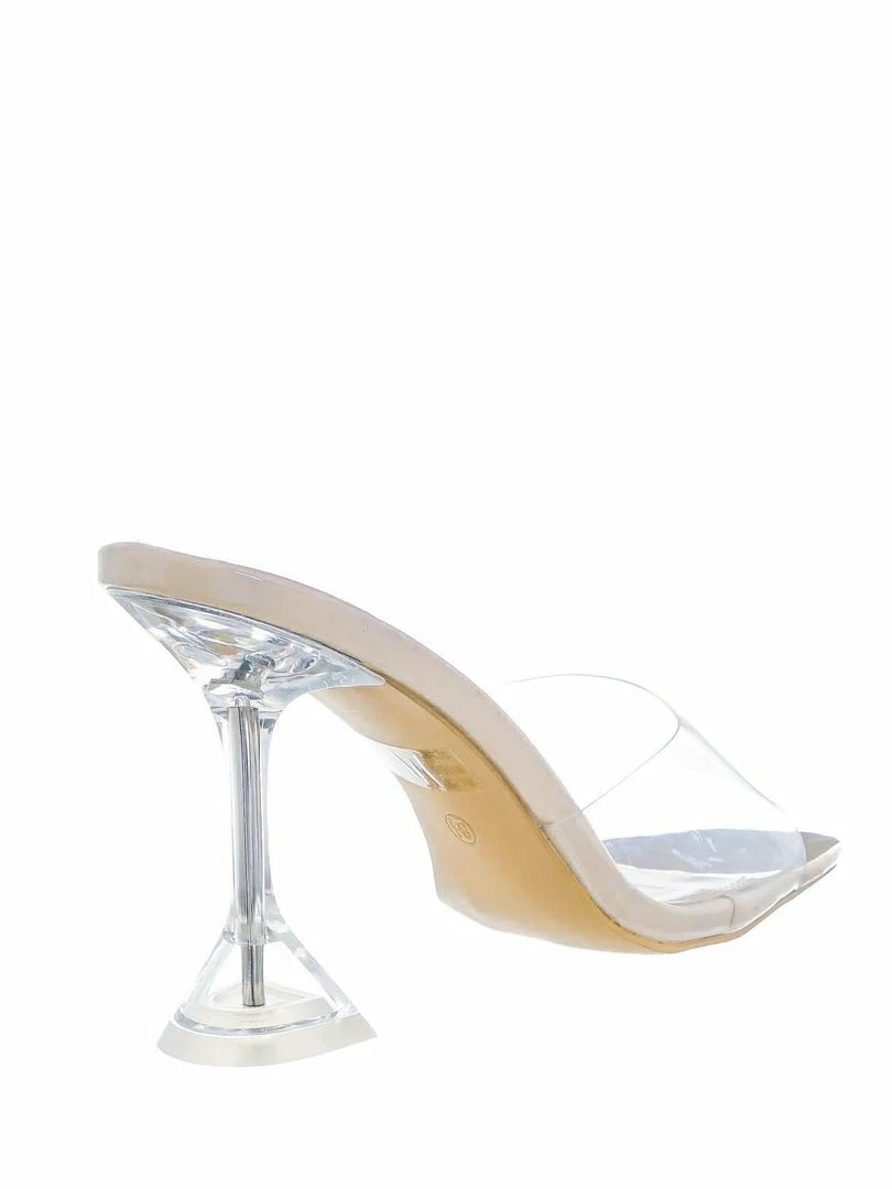 Product Detail : These mule sandals features a backless construction, opened square toe, acrylic hour glass heel, transparent clear vinyl upper, lightly padded insoles and man made outsoles.