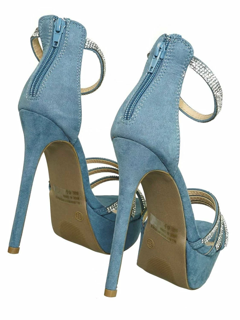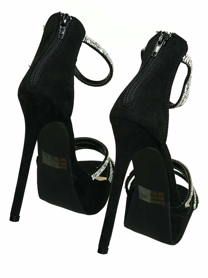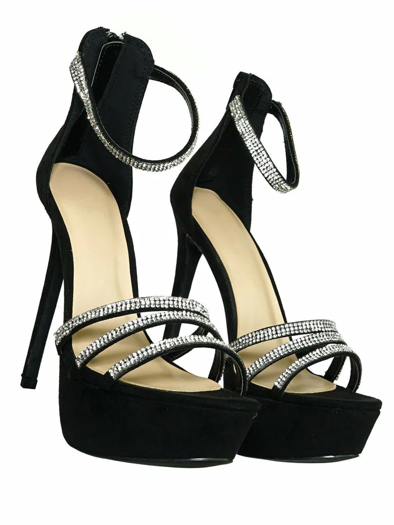 Product Detail : These dress sandals features a thick platform, open toe construction, rhinestone embellished triple foot strap, closed heel counter, zipper closure, rhinestone studded ankle strap, lightly padded insole and towering high thin stiletto heels.