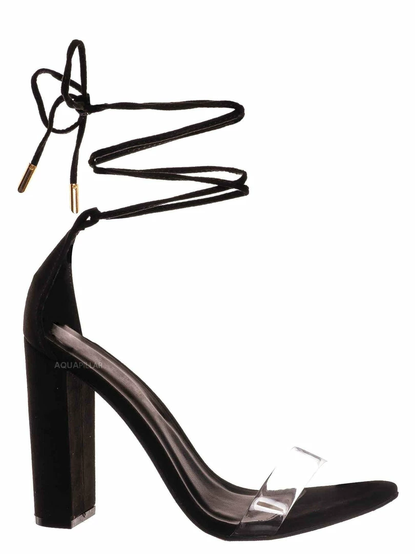 Product Detail: These high heel sandal features a chunky block heel, clear lucite / transparent foot strap, closed heel counter, lightly padded insole and ties up leg wrap strap.