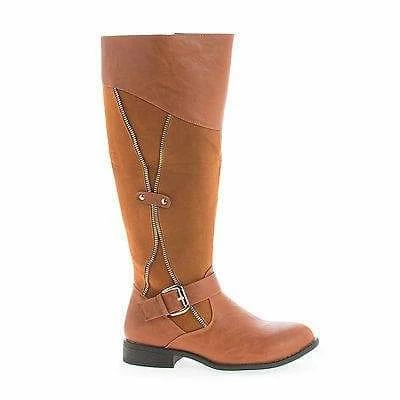 Dress up any outfit and walk in comfort with these knee high zipper riding boots, featuring a round toe, contrast stitching, a decorative buckle ankle strap, a zipper decorative look, an additional zipper on the side for easy wear and closure, a slightly padded insole for comfort, an approximate 15.25 inch high shaft, an approximate 0.25 inch platform, and an approximate 1 inch faux wooden heel. (Please note that these measurements are based on a size 7). Style fits true to size. Available in Black, Cognac, etc. All man made materials. By Wild Diva Shoes.