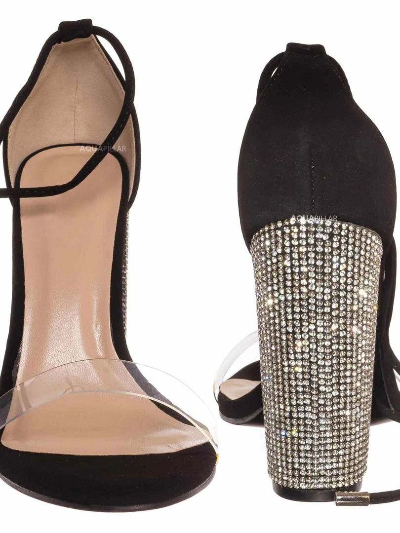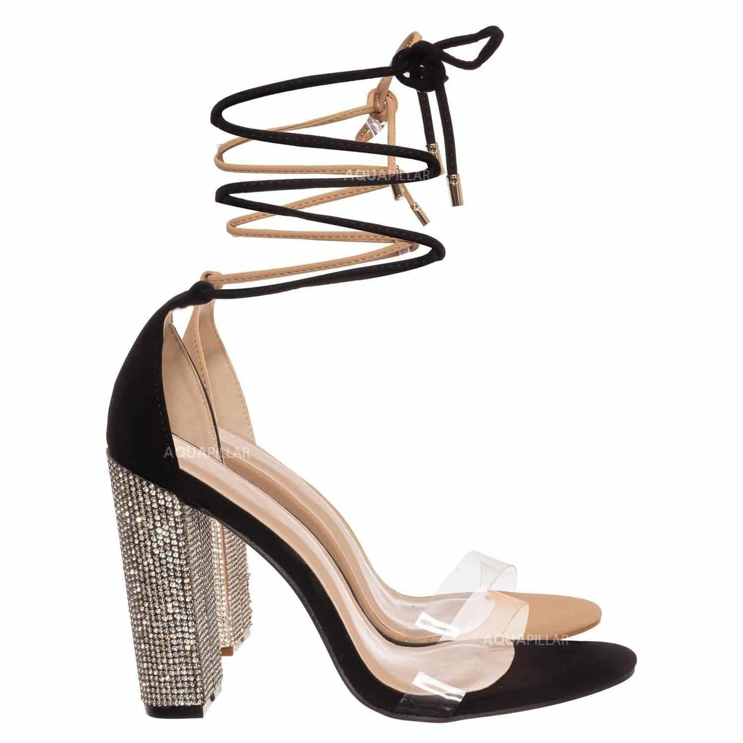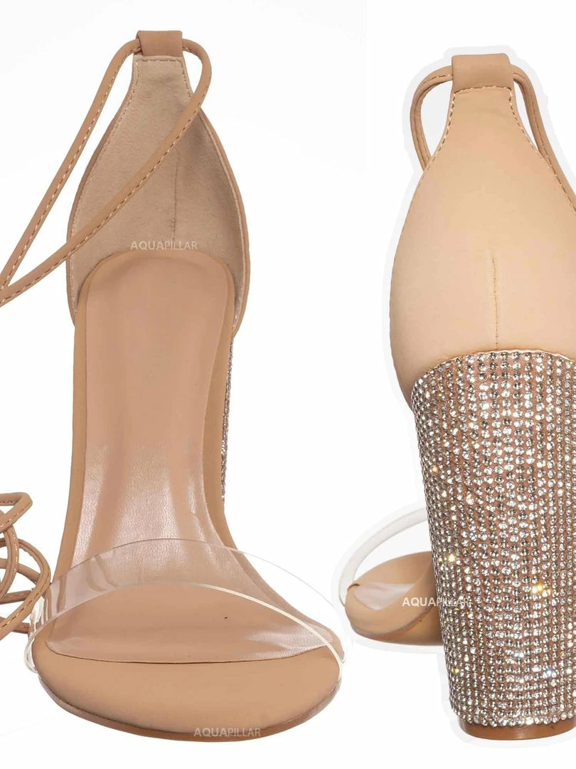Product Detail : These high heel sandal features a shimmering rhinestone crystal embellished chunky block heel with a Lucite / clear vinyl foot strap and leg wrap lace up closure. The heel has a two piece construction with thin transparent strap and closed heel counter.