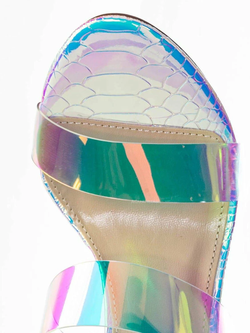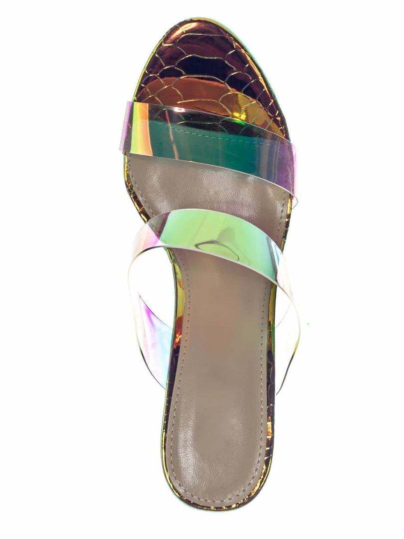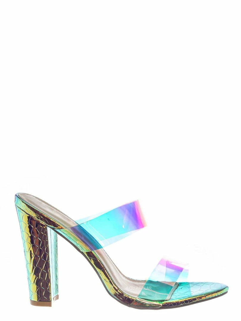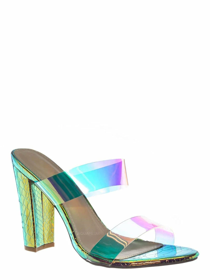 Product Detail : These high heel mule features a chunky block high heel, peep toe opening, slide in construction, double clear vinyl / Lucite / transparent vamp, lightly padded insole, snake embossed print upper and metallic iridescent fabric.