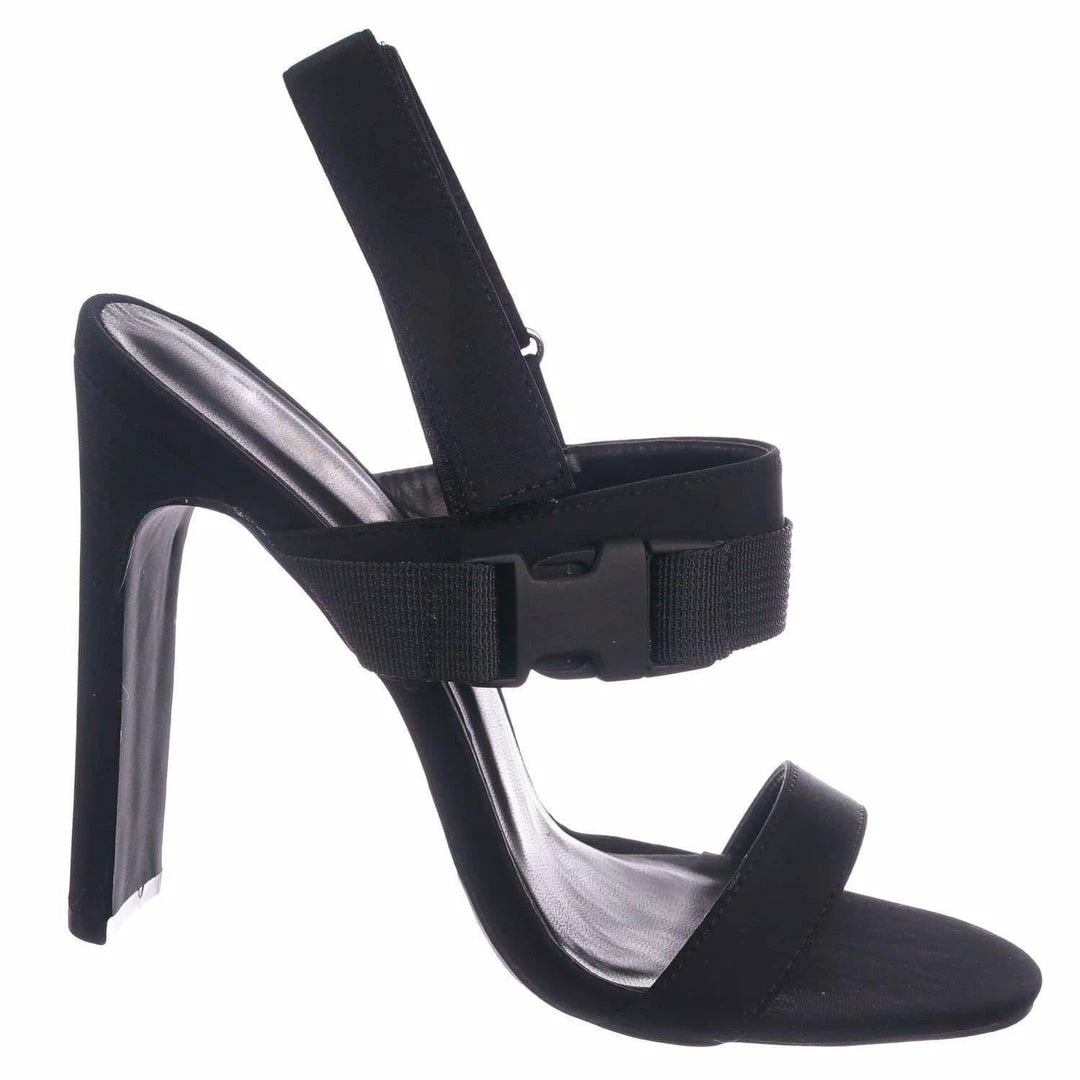 Product Detail : These strappy sandal features a sporty silhouette, hook and loop sling back closure, metal hardware, contrasting decorative buckle, thin straps, open rounded toe, chunky wide and flat high heel, neoprene upper and lightly padded insole.